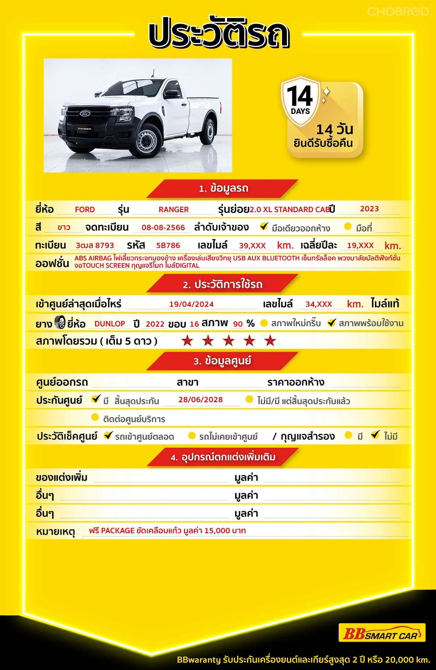 มีการรับประกันจากดีลเลอร์ (6 เดือน) มีบริการช่วยเหลือฉุกเฉินบนท้องถนน 24 ชม. จากดีลเลอร์