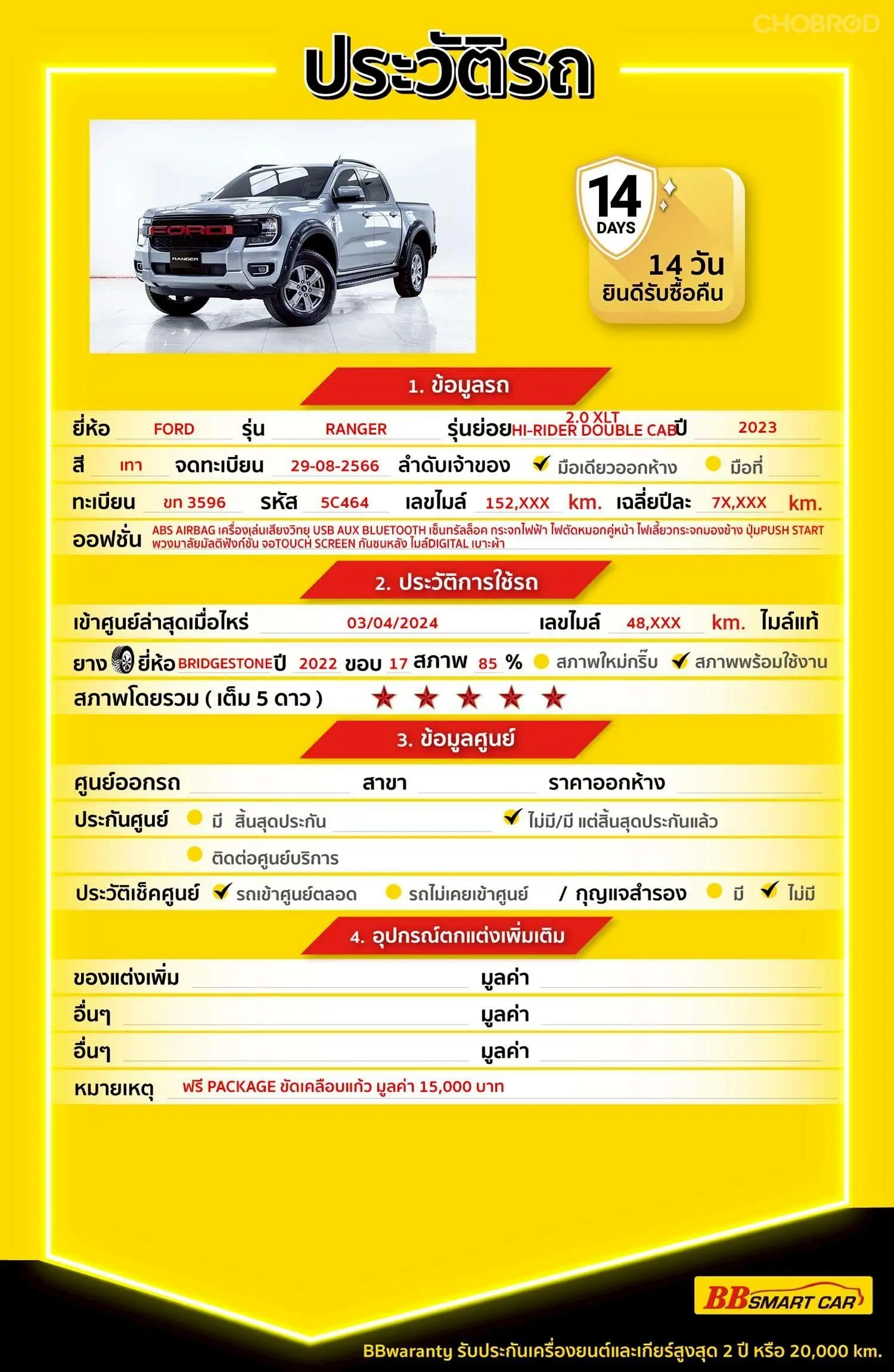FORD RANGER 2.0 XLT HI-RIDER DOUBLE CAB AT 2023 ออกรถ 0 บาท จัดได้ 589,000 บ. Line:@BBCAR05 🔥จอง 199 บาท ส่งบัตรประชาชน รู้ผลพิจารณาภายใน 30 นาที ไม่ผ่านคืนเงินจองทุกกรณี 🔥ซื้อรถกับ BB พร้อมให้คำปรึกษา แก้ทุกปัญหา ให้ทุกเรื่อง บริการ call center 24 ชม. 🔥BB Care Plus รับประกันหลังการขาย สูงสุด 2 ปี หรือ 20,000 km. 🔥มีรถให้เลือกมากกว่า 1,800 คัน สาขา5 ถ.เศรษฐกิจ ใกล้โลตัสมหาชัย รหัสรถ 5C464 ราคา 569,000 บาท ผ่อนเพียง 9,693 บาท Brand. : FORD Year. : 2023 Model. : RANGER Grade. : 2.0 XLT DOUBLE CAB HI-RIDER Engine. : 2000 CC Type. : ดีเซล Gearbox : AT Color. : เทา Mileage. : 152,XXX KM. (ซื้อสด ราคานี้ยังไม่รวมค่าดำเนินการ 10,000 บ.) 🚩 Price. 569,000 บาท ยอดจัด : 579,000 บาท เงินดาวน์ : 0 บาท ประกันภัย : ฟรีประกันภัย 1 ปี ค่าดำเนินการ : 10,000 บาท รวมออกรถ : 0 บาท ผ่อน 36 งวด = 18,650 บาท ผ่อน 48 งวด = 14,348 บาท ผ่อน 60 งวด = 11,921 บาท ผ่อน 72 งวด = 10,665 บาท ผ่อน 84 งวด = 9,693 บาท เงื่อนไขเป็นไปตามที่ไฟแนนซ์กำหนด โปรโมชั่นพิเศษ สำหรับลูกค้าเครดิตดีเลือกรับเรทดอกเบี้ยพิเศษ 📍36 งวด = 1.29 % 📍48 งวด = 1.99 % 📍60 งวด = 2.39 % 📍72 งวด = 3.59 % 🔥เงื่อนไข โปรโมชั่น ดอกเบี้ยเริ่มต้น 1.29% ตลอดอายุสัญญา - ยอดจัดไฟแนนซ์ 300,000-600,000 บาท - ผ่อนสูงสุด 72 เดือน - เป็นลูกค้าประวัติดี พนักงานประจำเงินเดือน 20,000 ขึ้นไป - ค่าดำเนินการแคมเปญ 20,000 บาท (รวมในยอดจัดได้) 🎗Car Hightlight รถสวยๆ วันนี้ขอแนะนำ FORD RANGER 2.0 XLT DOUBLE CAB HI-RIDER AT 2023 ออฟชั่น 1.1 ไมล์ Digital 1.2 จอ LCD เล่น DVD 1.3 กระจกมองข้างพับไฟฟ้า 🎗ภายใน ไมล์ Digital เบรค ABS กระจกมองข้างปรับไฟฟ้า Airbag วิทยุ - CD แอร์ กระจกไฟฟ้า จอ LCD เล่น DVD เซ็นทรัลล๊อก เบาะผ้า Navigator พวงมาลัย Multifunction 🎗ภายนอก รถสีเทา กันชนแต่ง กระจกมองข้างพับไฟฟ้า บันไดข้าง ไฟตัดหมอก ไฟเลี้ยวกระจกมองข้าง คิ้วกันสาด แล็คหลังคา 🎗ความคุ้มค่า สำหรับคันนี้หากเปรียบเทียบราคากับคุณภาพ คันนี้ถือว่าคุ้มค่ามากค่ะ ผ่อนสบายๆก็มีรถขับได้ รถดีมีคุณภาพแบบนี้รีบตัดสินใจซื้อได้เลราคานี้มาไวไปไวนะคะ ⭐️การรับประกันหลังการขาย BB Care Plus สูงสุด 2 ปี หรือ 20,000 km. ด้วยช่างที่ผ่านการอบรมจากศูนย์ชั้นนำของประเทศ 🎉Special offer เฉพาะ บีบีสมาร์ทคาร์ ที่นี่ที่เดียว ⭐ดอกเบี้ยเริ่มต้น 1.29% มีไฟแนนซ์รองรับหลายที่ค่ะ ⭐ฟรี!! แพคเก็จ ขัดเคลือบแก้ว มูลค่า 15,000 บาท ทุกคัน ⭐อนุมัติไว 30 นาที นำเอกสารมาให้ครบรับรถกลับบ้านทันทีค่ะ ⭐BB Care Plus รับประกันหลังการขาย สูงสุด 2 ปี หรือ 20,000 km. ⭐มี 6 สาขา ในกรุงเทพและปริมณฑลใกล้บ้านท่าน ⭐รถทุกคันผ่านตรวจสอบ Inspection เรียบแล้วค่ะ ผ่าน 5 ดาวทุกคันค่ะ ⭐เซลล์ทุกท่านเป็นมืออาชีพพร้อมให้บริการทุกท่านแน่นอนค่ะ เลือกข้อเสนอที่ให้คุณมากกว่าที่อื่น เพราะเราเล็งเห็นแล้ว ที่บีบีสมาร์ทคาร์ ให้คุณได้มากกว่าที่อื่นแน่นอนครับ มาที่เดียวจบทุกปัญหา หลากหลายรุ่นให้เลือกกับบริการที่คุณต้องประทับใจแน่นอนครับ