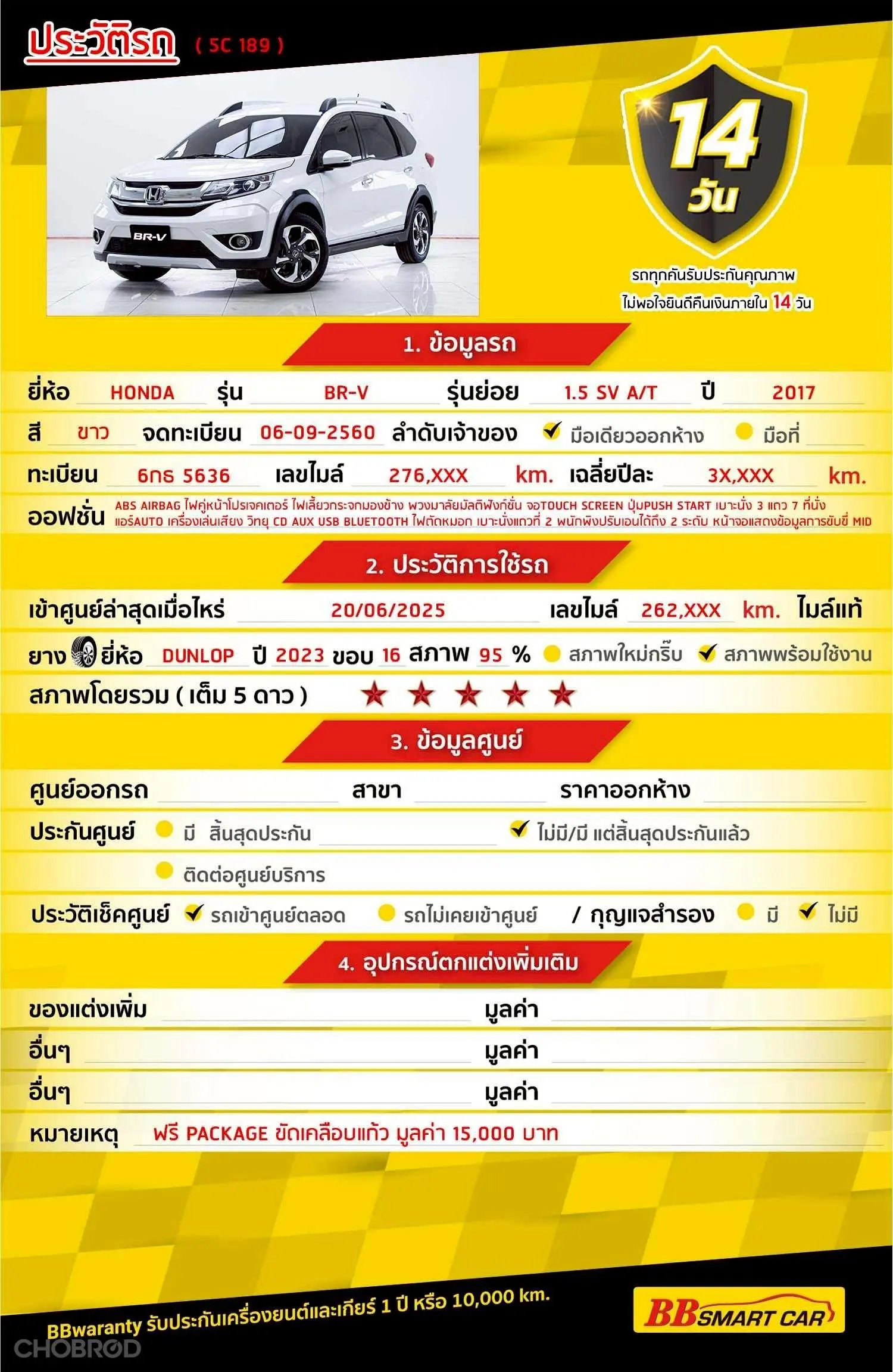 5C189 ขายรถยนต์ Honda BR-V 1.5 SV ปี 2017 สภาพดีมาก