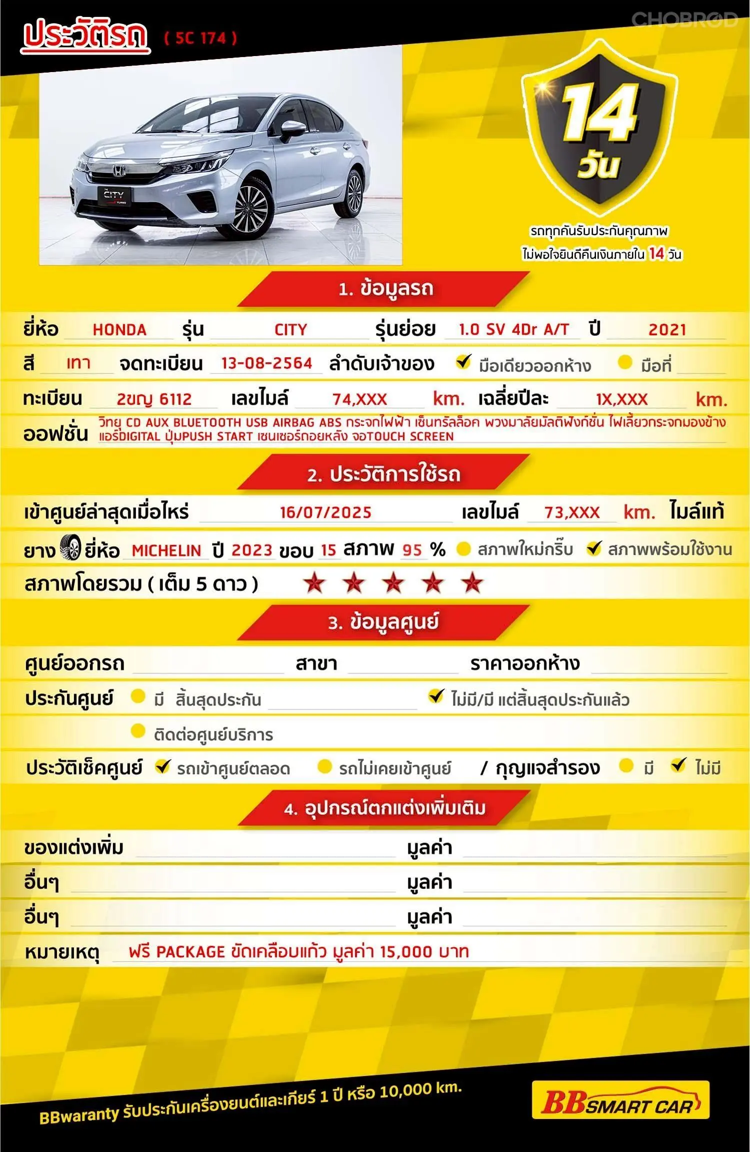 มีการรับประกันจากดีลเลอร์ (6 เดือน) มีบริการช่วยเหลือฉุกเฉินบนท้องถนน 24 ชม. จากดีลเลอร์