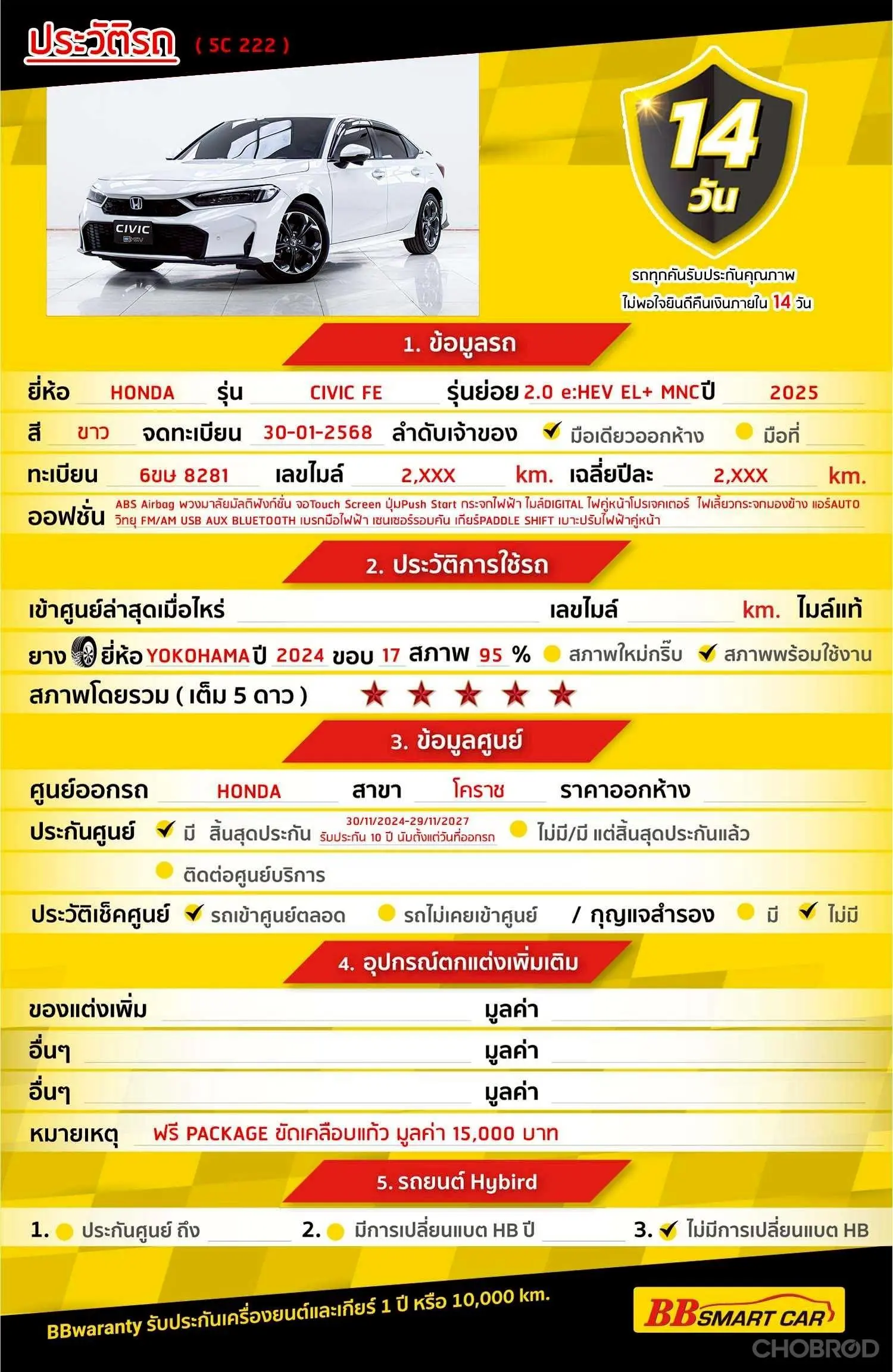 HONDA CIVIC FE 2.0 E HEV EL+ AT 2025 ออกรถ 0 บาท จัดได้ 979,000 บ. Line:@BBCAR05 🔥จอง 199 บาท ส่งบัตรประชาชน รู้ผลพิจารณาภายใน 30 นาที ไม่ผ่านคืนเงินจองทุกกรณี 🔥ซื้อรถกับ BB พร้อมให้คำปรึกษา แก้ทุกปัญหา ให้ทุกเรื่อง บริการ call center 24 ชม. 🔥BB Care Plus รับประกันหลังการขาย สูงสุด 2 ปี หรือ 20,000 km. 🔥มีรถให้เลือกมากกว่า 1,800 คัน สาขา5 ถ.เศรษฐกิจ ใกล้โลตัสมหาชัย รหัสรถ 5C222 ราคา 959,000 บาท ผ่อนเพียง 16,222 บาท Brand. : HONDA Year. : 2025 Model. : CIVIC FE Grade. : 2.0 E HEV EL+ Engine. : 2000 CC Type. : เบนซิน+ไฟฟ้า Gearbox : AT Color. : ขาว Mileage. : 2,XXX KM (ซื้อสด ราคานี้ยังไม่รวมค่าดำเนินการ 10,000 บ.) 🚩 Price. 959,000 บาท ยอดจัด : 969,000 บาท เงินดาวน์ : 0 บาท ประกันภัย : ฟรีประกันภัย 1 ปี ค่าดำเนินการ : 10,000 บาท รวมออกรถ : 0 บาท ผ่อน 36 งวด = 31,212 บาท ผ่อน 48 งวด = 24,011 บาท ผ่อน 60 งวด = 19,950 บาท ผ่อน 72 งวด = 17,848 บาท ผ่อน 84 งวด = 16,222 บาท เงื่อนไขเป็นไปตามที่ไฟแนนซ์กำหนด** โปรโมชั่นพิเศษ สำหรับลูกค้าเครดิตดี 🚩เลือกรับเรทดอกเบี้ยพิเศษ 📍36 งวด = 1.29 % 📍48 งวด = 1.99 % 📍60 งวด = 2.39 % 📍72 งวด = 3.59 % 🔥เงื่อนไข โปรโมชั่น ดอกเบี้ยเริ่มต้น 1.29% ตลอดอายุสัญญา - ยอดจัดไฟแนนซ์ 300,000-600,0000 บาท - ผ่อนสูงสุด 72 เดือน - เป็นลูกค้าประวัติดี พนักงานประจำเงินเดือน 20,000 ขึ้นไป - ค่าดำเนินการแคมเปญ 20,000 บาท (รวมในยอดจัดได้) 🎗Car Hightlight รถสวยๆ วันนี้ขอแนะนำ HONDA CIVIC 1.8 EL FC-FK เบนซิน 1 : จอ LCD เล่น DVD 2 : เซนเซอร์ถอยหลัง เซนเซอร์รอบคัน 3 : เบาะไฟฟ้าคู่หน้า 🎗ภายใน เบรกมือไฟฟ้า พวงมาลัย Multifunction เบาะไฟฟ้าคู่หน้า เบรค ABS Navigator จอ LCD เล่น DVD เซ็นทรัลล๊อก เกียร์ Paddle Shift วิทยุ - CD Cruise Control เบาะหนัง ไมล์ Digital Airbag กระจกไฟฟ้า กระจกมองข้างปรับไฟฟ้า แอร์ AUTO 🎗ภายนอก เซนเซอร์ถอยหลัง เซนเซอร์รอบคัน คิ้วกันสาด ไฟเลี้ยวกระจกมองข้าง กระจกมองข้างพับไฟฟ้า 🎗ความคุ้มค่า สำหรับคันนี้หากเปรียบเทียบราคากับคุณภาพ คันนี้ถือว่าคุ้มค่ามากค่ะ ผ่อนสบายๆก็มีรถขับได้ รถดีมีคุณภาพแบบนี้รีบตัดสินใจซื้อได้เลราคานี้มาไวไปไวนะคะ ⭐️การรับประกันหลังการขาย BB Care Plus สูงสุด 2 ปี หรือ 20,000 km. ด้วยช่างที่ผ่านการอบรมจากศูนย์ชั้นนำของประเทศ 🎉Special offer เฉพาะ บีบีสมาร์ทคาร์ ที่นี่ที่เดียว ⭐ดอกเบี้ยเริ่มต้น 1.29% มีไฟแนนซ์รองรับหลายที่ค่ะ ⭐ฟรี!! แพคเก็จ ขัดเคลือบแก้ว มูลค่า 15,000 บาท ทุกคัน ⭐อนุมัติไว 30 นาที นำเอกสารมาให้ครบรับรถกลับบ้านทันทีค่ะ ⭐BB Care Plus รับประกันหลังการขาย สูงสุด 2 ปี หรือ 20,000 km. ⭐มี 6 สาขา ในกรุงเทพและปริมณฑลใกล้บ้านท่าน ⭐รถทุกคันผ่านตรวจสอบ Inspection เรียบแล้วค่ะ ผ่าน 5 ดาวทุกคันค่ะ ⭐เซลล์ทุกท่านเป็นมืออาชีพพร้อมให้บริการทุกท่านแน่นอนค่ะ