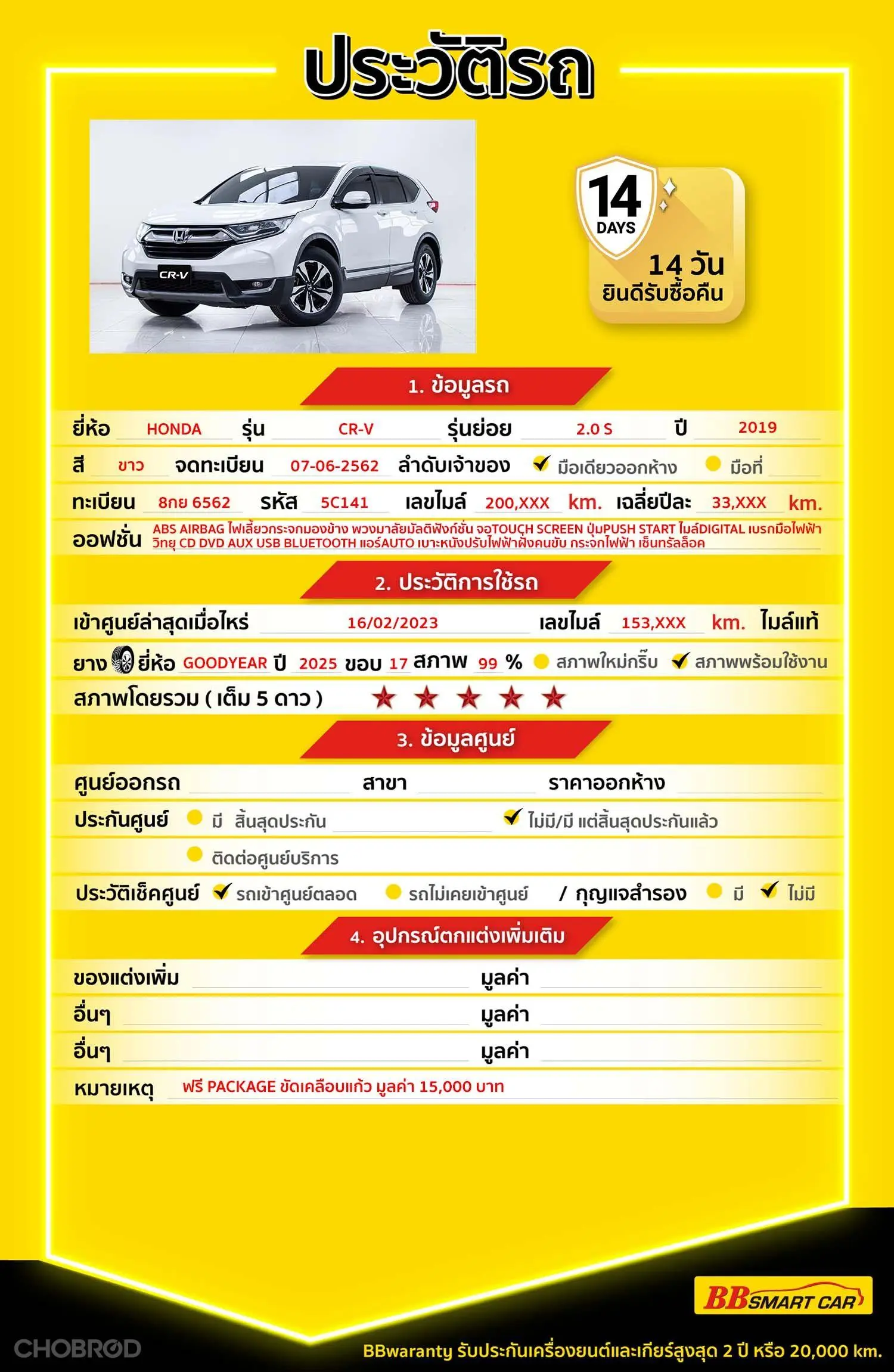 HONDA CR-V 2.4 S AT 2019 ออกรถ 0 บาท จัดได้ 569,000 บ. Line:@*******แสดงข้อมูล 🔥จอง 199 บาท ส่งบัตรประชาชน รู้ผลพิจารณาภายใน 30 นาที ไม่ผ่านคืนเงินจองทุกกรณี 🔥ซื้อรถกับ BB พร้อมให้คำปรึกษา แก้ทุกปัญหา ให้ทุกเรื่อง บริการ call center 24 ชม. 🔥BB Care Plus รับประกันหลังการขาย สูงสุด 2 ปี หรือ 20,000 km. 🔥มีรถให้เลือกมากกว่า 1,800 คัน สาขา5 ถ.เศรษฐกิจ ใกล้โลตัสมหาชัย รหัสรถ 5C141 ราคา 549,000 บ. ผ่อนเพียง 9,861 บ. Brand. : HONDA Year. : 2019 Model. : CR-V Grade. : 2.4 S Engine. : 2400 CC Type. : ดีเซล Gearbox. : A/T Color. : ขาว Mileage. : 200,xxx km. (ซื้อสด ราคานี้ยังไม่รวมค่าดำเนินการ 10,000 บ.) 🚩 Price. 549,000 บาท ยอดจัด : 559,000 บาท เงินดาวน์. : 0 บาท ประกันภัย : ฟรีประกันภัย 1 ปี ค่าดำเนินการ : 10,000 บาท รวมออกรถ 0 บาท ผ่อน36= 18,972 บาท ผ่อน48 = 14,595 บาท ผ่อน60 = 12,126 บาท ผ่อน72 = 10,849 บาท ผ่อน84 = 9,861 บาท เงื่อนไขเป็นไปตามที่ไฟแนนซ์กำหนด** โปรโมชั่นพิเศษ สำหรับลูกค้าเครดิตดี 🚩เลือกรับเรทดอกเบี้ยพิเศษ 📍36 งวด = 1.29 % 📍48 งวด = 1.99 % 📍60 งวด = 2.39 % 📍72 งวด = 3.59 % 🔥เงื่อนไข โปรโมชั่น ดอกเบี้ยเริ่มต้น 1.29% ตลอดอายุสัญญา - ยอดจัดไฟแนนซ์ 300,000-600,0000 บาท - ผ่อนสูงสุด 72 เดือน - เป็นลูกค้าประวัติดี พนักงานประจำเงินเดือน 20,000 ขึ้นไป - ค่าดำเนินการแคมเปญ 20,000 บาท (รวมในยอดจัดได้) 🎗Car Hightlight.รถครอบครัว SUV ใหม่มาพร้อม 7 ที่นั่งครั้งแรกของฮอนด้า ภายนอกล้ำอนาคตฉีกรูปแบบเดิมๆ ภายในกว้างขึ้นหรูหราและอเนกประสงค์ขึ้น ประตูท้ายไฟฟ้าพร้อมระบบเปิดด้วยปลายเท้า 🎗ภายใน.ภายในซีอาร์-วี ให้ความหรูหราผสมกับความล้ำอนาคต คอนโซลใช้วัสดุนุ่มมือรวมถึงแผงประตูข้างด้านหน้า Airbag แอร์ AUTO เซ็นทรัลล๊อก จอ LCD เล่น DVD เบรกมือไฟฟ้า วิทยุ - CD เบาะไฟฟ้าคนขับ กระจกไฟฟ้า พวงมาลัย Multifunction เบรค ABS เบาะหนัง ไมล์ Digital 🎗ภายนอก. คิ้วกันสาด ไฟตัดหมอก ไฟเลี้ยวกระจกมองข้าง กระจกมองข้างพับไฟฟ้า กระจกมองข้างปรับไฟฟ้า 🎗ความคุ้มค่า. ด้วยรูปลักษณ์ภายนอก ภายใน ที่ดูล้ำสมัย แถมยังมาพร้อมกับเทคโนโลยีใหม่ๆ หลายรายการ มันจึงเป็นรถที่เรียกเสียงฮือฮาในโลกออนไลน์ได้เป็นอย่างมาก ⭐️การรับประกันหลังการขาย BB Care Plus สูงสุด 2 ปี หรือ 20,000 km. ด้วยช่างที่ผ่านการอบรมจากศูนย์ชั้นนำของประเทศ 🎉Special offer เฉพาะ บีบีสมาร์ทคาร์ ที่นี่ที่เดียว ⭐ดอกเบี้ยเริ่มต้น 1.29% มีไฟแนนซ์รองรับหลายที่ค่ะ ⭐ฟรี!! แพคเก็จ ขัดเคลือบแก้ว มูลค่า 15,000 บาท ทุกคัน ⭐อนุมัติไว 30 นาที นำเอกสารมาให้ครบรับรถกลับบ้านทันทีค่ะ ⭐BB Care Plus รับประกันหลังการขาย สูงสุด 2 ปี หรือ 20,000 km. ⭐มี 6 สาขา ในกรุงเทพและปริมณฑลใกล้บ้านท่าน ⭐รถทุกคันผ่านตรวจสอบ Inspection เรียบร้อยแล้วค่ะ ผ่าน 5 ดาวทุกคันค่ะ ⭐เซลล์ทุกท่านเป็นมืออาชีพพร้อมให้บริการทุกท่านแน่นอนค่ะ เลือกข้อเสนอที่ให้คุณ