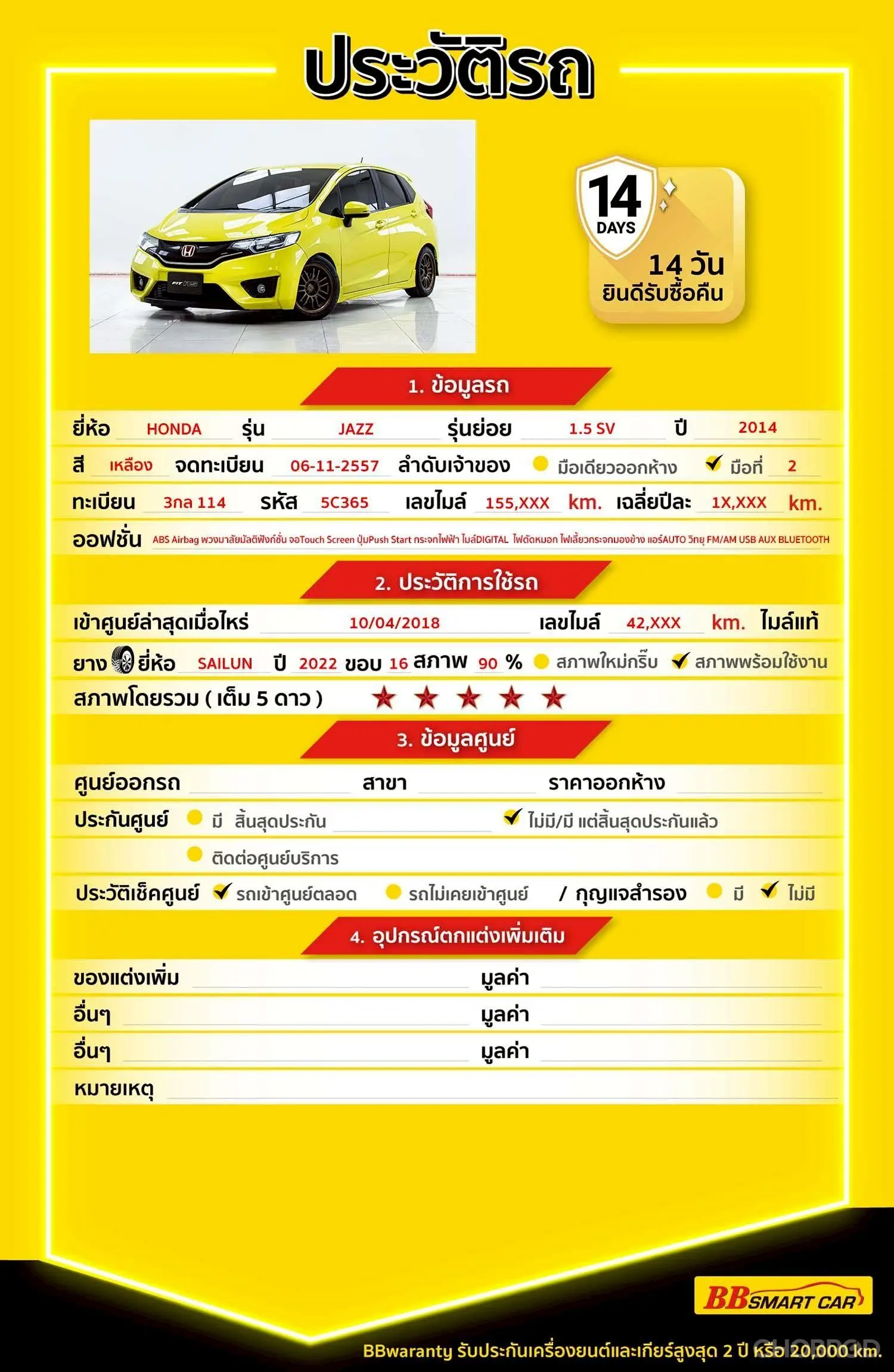 HONDA JAZZ 1.5 SV AT 2014 ออกรถ 0 บาท จัดได้ 369,000 บ. Line:@BBCAR05 🔥จอง 199 บาท ส่งบัตรประชาชน รู้ผลพิจารณาภายใน 30 นาที ไม่ผ่านคืนเงินจองทุกกรณี 🔥ซื้อรถกับ BB พร้อมให้คำปรึกษา แก้ทุกปัญหา ให้ทุกเรื่อง บริการ call center 24 ชม. 🔥BB Care Plus รับประกันหลังการขาย สูงสุด 2 ปี หรือ 20,000 km. 🔥มีรถให้เลือกมากกว่า 1,800 คัน สาขา5 ถ.เศรษฐกิจ ใกล้โลตัสมหาชัย รหัสรถ 5C365 ราคา 349,000 บาท ผ่อนเพียง 6,459 บาท Brand. : HONDA Year. : 2014 Model. : JAZZ Grade. : 1.5 SV Engine. : 1500 CC Type. : เบนซิน Gearbox : A/T Color. : เหลือง Mileage. :155,XXX KM. (ซื้อสด ราคานี้ยังไม่รวมค่าดำเนินการ 10,000 บ.) 🚩 Price. 349,000 บาท ยอดจัด : 359,000 บาท เงินดาวน์ : 0 บาท ประกันภัย : ฟรีประกันภัย 1 ปี ค่าดำเนินการ : 10,000 บาท รวมออกรถ : 0 บาท ผ่อน36 = 11,916 บาท ผ่อน48 = 9,248 บาท ผ่อน60 = 7,711 บาท ผ่อน72 = 6,933 บาท ผ่อน84 = 6,459 บาท เงื่อนไขเป็นไปตามที่ไฟแนนซ์กำหนด** โปรโมชั่นพิเศษ สำหรับลูกค้าเครดิตดี 🚩เลือกรับเรทดอกเบี้ยพิเศษ 📍36 งวด = 1.29 % 📍48 งวด = 1.99 % 📍60 งวด = 2.39 % 📍72 งวด = 3.59 % 🔥เงื่อนไข โปรโมชั่น ดอกเบี้ยเริ่มต้น 1.29% ตลอดอายุสัญญา - ยอดจัดไฟแนนซ์ 300,000-600,0000 บาท - ผ่อนสูงสุด 72 เดือน - เป็นลูกค้าประวัติดี พนักงานประจำเงินเดือน 20,000 ขึ้นไป - ค่าดำเนินการแคมเปญ 20,000 บาท (รวมในยอดจัดได้) 🎗Car Hightlight รถสวยๆ วันนี้ขอแนะนำ HONDA JAZZ 1.5 SV 2014 AT เบนซิน จุดเด่นออฟชั่น - เซนเซอร์ถอยหลัง - จอ LCD เล่น DVD - เกียร์ Paddle Shift 🎗ภายใน กระจกมองข้างปรับไฟฟ้า เซ็นทรัลล๊อก เกียร์ Paddle Shift แอร์ AUTO กระจกไฟฟ้า วิทยุ - CD จอ LCD เล่น DVD เบาะหนัง Airbag พวงมาลัย Multifunction เบรค ABS 🎗ภายนอก ไฟตัดหมอก ไฟเลี้ยวกระจกมองข้าง เซนเซอร์ถอยหลัง คิ้วกันสาด กระจกมองข้างพับไฟฟ้า 🎗ความคุ้มค่า สำหรับคันนี้หากเปรียบเทียบราคากับคุณภาพ คันนี้ถือว่าคุ้มค่ามากค่ะ ผ่อนสบายๆก็มีรถขับได้ รถดีมีคุณภาพแบบนี้รีบตัดสินใจซื้อได้เลราคานี้มาไวไปไวนะคะ ⭐️การรับประกันหลังการขาย BB Care Plus สูงสุด 2 ปี หรือ 20,000 km. ด้วยช่างที่ผ่านการอบรมจากศูนย์ชั้นนำของประเทศ 🎉Special offer เฉพาะ บีบีสมาร์ทคาร์ ที่นี่ที่เดียว ⭐ดอกเบี้ยเริ่มต้น 1.29% มีไฟแนนซ์รองรับหลายที่ค่ะ ⭐ฟรี!! แพคเก็จ ขัดเคลือบแก้ว มูลค่า 15,000 บาท ทุกคัน ⭐อนุมัติไว 30 นาที นำเอกสารมาให้ครบรับรถกลับบ้านทันทีค่ะ ⭐BB Care Plus รับประกันหลังการขาย สูงสุด 2 ปี หรือ 20,000 km. ⭐มี 6 สาขา ในกรุงเทพและปริมณฑลใกล้บ้านท่าน ⭐รถทุกคันผ่านตรวจสอบ Inspection เรียบแล้วค่ะ ผ่าน 5 ดาวทุกคันค่ะ ⭐เซลล์ทุกท่านเป็นมืออาชีพพร้อมให้บริการทุกท่านแน่นอนค่ะ