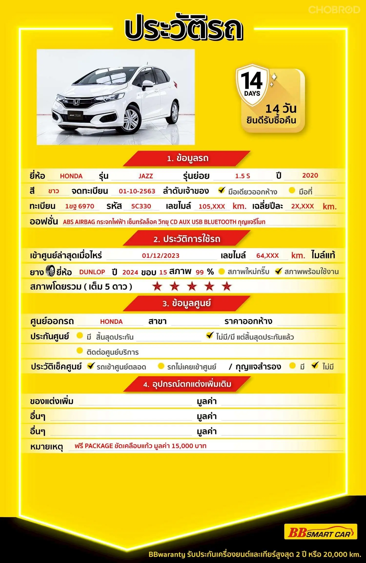 HONDA JAZZ 1.5 S AT 2020 ออกรถ 0 บาท จัดได้ 459,000 บ. Line:@*******แสดงข้อมูล 🔥จอง 199 บาท ส่งบัตรประชาชน รู้ผลพิจารณาภายใน 30 นาที ไม่ผ่านคืนเงินจองทุกกรณี 🔥ซื้อรถกับ BB พร้อมให้คำปรึกษา แก้ทุกปัญหา ให้ทุกเรื่อง บริการ call center 24 ชม. 🔥BB Care Plus รับประกันหลังการขาย สูงสุด 2 ปี หรือ 20,000 km. 🔥มีรถให้เลือกมากกว่า 1,800 คัน สาขา5 ถ.เศรษฐกิจ ใกล้โลตัสมหาชัย รหัสรถ 5C330 ราคา 439,000 บาท ผ่อนเพียง 7,517 บาท Brand. : HONDA Year. : 2020 Model. : JAZZ Grade. : 1.5 S Engine. : 1500 CC Type. : เบนซิน Gearbox : AT Color. : ขาว Mileage. : 105,XXX KM. (ซื้อสด ราคานี้ยังไม่รวมค่าดำเนินการ 10,000 บ.) 🚩 Price. 439,000 บาท ยอดจัด : 449,000 บาท เงินดาวน์ : 0 บาท ประกันภัย : ฟรีประกันภัย 1 ปี ค่าดำเนินการ : 10,000 บาท รวมออกรถ : 0 บาท ผ่อน36 = 14,462 บาท ผ่อน48 = 11,126 บาท ผ่อน60 = 9,245 บาท ผ่อน72 = 8,270 บาท ผ่อน84 = 7,517 บาท เงื่อนไขเป็นไปตามที่ไฟแนนซ์กำหนด** โปรโมชั่นพิเศษ สำหรับลูกค้าเครดิตดี 🚩เลือกรับเรทดอกเบี้ยพิเศษ 📍36 งวด = 1.29 % 📍48 งวด = 1.99 % 📍60 งวด = 2.39 % 📍72 งวด = 3.59 % 🔥เงื่อนไข โปรโมชั่น ดอกเบี้ยเริ่มต้น 1.29% ตลอดอายุสัญญา - ยอดจัดไฟแนนซ์ 300,000-600,0000 บาท - ผ่อนสูงสุด 72 เดือน - เป็นลูกค้าประวัติดี พนักงานประจำเงินเดือน 20,000 ขึ้นไป - ค่าดำเนินการแคมเปญ 20,000 บาท (รวมในยอดจัดได้) 🎗Car Hightlight รถสวยๆ วันนี้ขอแนะนำ HONDA JAZZ 1.5 S AT เบนซิน จุดเด่นออฟชั่น - เซนเซอร์ถอยหลัง - วิทยุ - CD - พวงมาลัยเพาเวอร์ 🎗ภายใน เบรค ABS กุญแจรีโมท-สัญญานกันขโมย แอร์ พวงมาลัยเพาเวอร์ วิทยุ - CD Airbag เบาะผ้า เซ็นทรัลล๊อก 🎗ภายนอก กระจกมองข้างพับไฟฟ้า เซนเซอร์ถอยหลัง กระจกมองข้างปรับไฟฟ้า กระจกไฟฟ้า 🎗ความคุ้มค่า สำหรับคันนี้หากเปรียบเทียบราคากับคุณภาพ คันนี้ถือว่าคุ้มค่ามากค่ะ ผ่อนสบายๆก็มีรถขับได้ รถดีมีคุณภาพแบบนี้รีบตัดสินใจซื้อได้เลราคานี้มาไวไปไวนะคะ ⭐️การรับประกันหลังการขาย BB Care Plus สูงสุด 2 ปี หรือ 20,000 km. ด้วยช่างที่ผ่านการอบรมจากศูนย์ชั้นนำของประเทศ 🎉Special offer เฉพาะ บีบีสมาร์ทคาร์ ที่นี่ที่เดียว ⭐ดอกเบี้ยเริ่มต้น 1.29% มีไฟแนนซ์รองรับหลายที่ค่ะ ⭐ฟรี!! แพคเก็จ ขัดเคลือบแก้ว มูลค่า 15,000 บาท ทุกคัน ⭐อนุมัติไว 30 นาที นำเอกสารมาให้ครบรับรถกลับบ้านทันทีค่ะ ⭐BB Care Plus รับประกันหลังการขาย สูงสุด 2 ปี หรือ 20,000 km. ⭐มี 6 สาขา ในกรุงเทพและปริมณฑลใกล้บ้านท่าน ⭐รถทุกคันผ่านตรวจสอบ Inspection เรียบแล้วค่ะ ผ่าน 5 ดาวทุกคันค่ะ ⭐เซลล์ทุกท่านเป็นมืออาชีพพร้อมให้บริการทุกท่านแน่นอนค่ะ เลือกข้อเสนอที่ให้คุณมากกว่าที่อื่น เพราะเราเล็งเห็นแล้ว ที่บีบีสมาร์ทคาร์ ให้คุณได้มากกว่าที่อื่นแน่นอนครับ มาที่เดียวจบทุกปัญหา หลากหลายรุ่นให้เลือกกับบริการที่คุณต้องประทับใจแน่นอนครับ