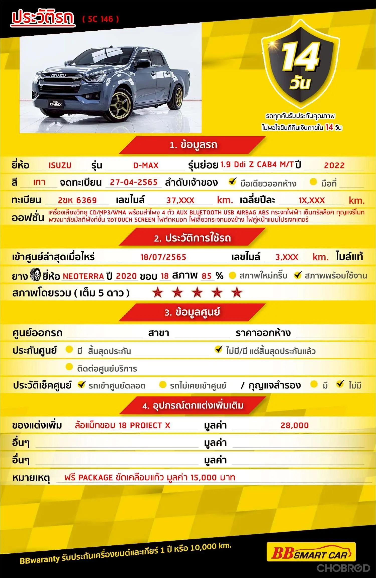 ISUZU D-MAX 1.9 Ddi Z CAB4 MT 2022 ออกรถ 0 บาท จัดได้ 609,000 บ. Line:@*******แสดงข้อมูล 🔥จอง 199 บาท ส่งบัตรประชาชน รู้ผลพิจารณาภายใน 30 นาที ไม่ผ่านคืนเงินจองทุกกรณี 🔥ซื้อรถกับ BB พร้อมให้คำปรึกษา แก้ทุกปัญหา ให้ทุกเรื่อง บริการ call center 24 ชม. 🔥BB Care Plus รับประกันหลังการขาย สูงสุด 2 ปี หรือ 20,000 km. 🔥มีรถให้เลือกมากกว่า 1,800 คัน สาขา5 ถ.เศรษฐกิจ ใกล้โลตัสมหาชัย รหัสรถ 5C146 ราคา 589,000 บาท ผ่อนเพียง 10,028 บาท Brand. : ISUZU Year. : 2022 Model. : D-MAX Grade. : 1.9 Ddi Z CAB4 Engine. : 1900 CC Type. : ดีเซล Gearbox : M/T Color. : เทา Mileage. : 37,XXX km. (ซื้อสด ราคานี้ยังไม่รวมค่าดำเนินการ 10,000 บ.) 🚩 Price. 589,000 บาท ยอดจัด : 599,000 บาท เงินดาวน์ : 0 บาท ประกันภัย : ฟรีประกันภัย 1 ปี ค่าดำเนินการ : 10,000 บาท รวมออกรถ : 0 บาท ผ่อน36= 19,294 บาท ผ่อน48 = 14,843 บาท ผ่อน60 = 12,333 บาท ผ่อน72 = 11,033 บาท ผ่อน84 = 10,028 บาท เงื่อนไขเป็นไปตามที่ไฟแนนซ์กำหนด** โปรโมชั่นพิเศษ สำหรับลูกค้าเครดิตดี 🚩เลือกรับเรทดอกเบี้ยพิเศษ 📍36 งวด = 1.29 % 📍48 งวด = 1.99 % 📍60 งวด = 2.39 % 📍72 งวด = 3.59 % 🔥เงื่อนไข โปรโมชั่น ดอกเบี้ยเริ่มต้น 1.29% ตลอดอายุสัญญา - ยอดจัดไฟแนนซ์ 300,000-600,0000 บาท - ผ่อนสูงสุด 72 เดือน - เป็นลูกค้าประวัติดี พนักงานประจำเงินเดือน 20,000 ขึ้นไป - ค่าดำเนินการแคมเปญ 20,000 บาท (รวมในยอดจัดได้) 🎗Car Hightlight รถสวยๆ ISUZU D-MAX 1.9 Ddi Z CAB4 2022 1 จอ LCD เล่น DVD 2 กระจกมองข้างปรับไฟฟ้า 3 ไฟโปรเจคเตอร์ 🎗ภายใน กระจกไฟฟ้า กุญแจรีโมท-สัญญานกันขโมย เบรค ABS พวงมาลัย Multifunction Airbag วิทยุ - CD แอร์ จอ LCD เล่น DVD เซ็นทรัลล๊อก กระจกมองข้างปรับไฟฟ้า เบาะหนัง 🎗ภายนอก. ตัวรถสีเทา กระจกมองข้างพับไฟฟ้า ไฟโปรเจคเตอร์ ไฟตัดหมอก ไฟเลี้ยวกระจกมองข้าง คิ้วกันสาด 🎗ความคุ้มค่า สำหรับคันนี้หากเปรียบเทียบราคากับคุณภาพ ถือว่าคุ้มค่ามากครับ ผ่อนสบายๆก็มีรถขับได้ รถดีมีคุณภาพแบบนี้รีบตัดสินใจซื้อได้เลย ราคานี้มาไวไปไวนะคะ ⭐️การรับประกันหลังการขาย BB Care Plus สูงสุด 2 ปี หรือ 20,000 km. ด้วยช่างที่ผ่านการอบรมจากศูนย์ชั้นนำของประเทศ 🎉Special offer เฉพาะ บีบีสมาร์ทคาร์ ที่นี่ที่เดียว ⭐ดอกเบี้ยเริ่มต้น 1.29% มีไฟแนนซ์รองรับหลายที่ค่ะ ⭐ฟรี!! แพคเก็จ ขัดเคลือบแก้ว มูลค่า 15,000 บาท ทุกคัน ⭐อนุมัติไว 30 นาที นำเอกสารมาให้ครบรับรถกลับบ้านทันทีค่ะ ⭐BB Care Plus รับประกันหลังการขาย สูงสุด 2 ปี หรือ 20,000 km. ⭐มี 6 สาขา ในกรุงเทพและปริมณฑลใกล้บ้านท่าน ⭐รถทุกคันผ่านตรวจสอบ Inspection เรียบร้อยแล้วค่ะ ผ่าน 5 ดาวทุกคันค่ะ ⭐เซลล์ทุกท่านเป็นมืออาชีพพร้อมให้บริการทุกท่านแน่นอนค่ะ