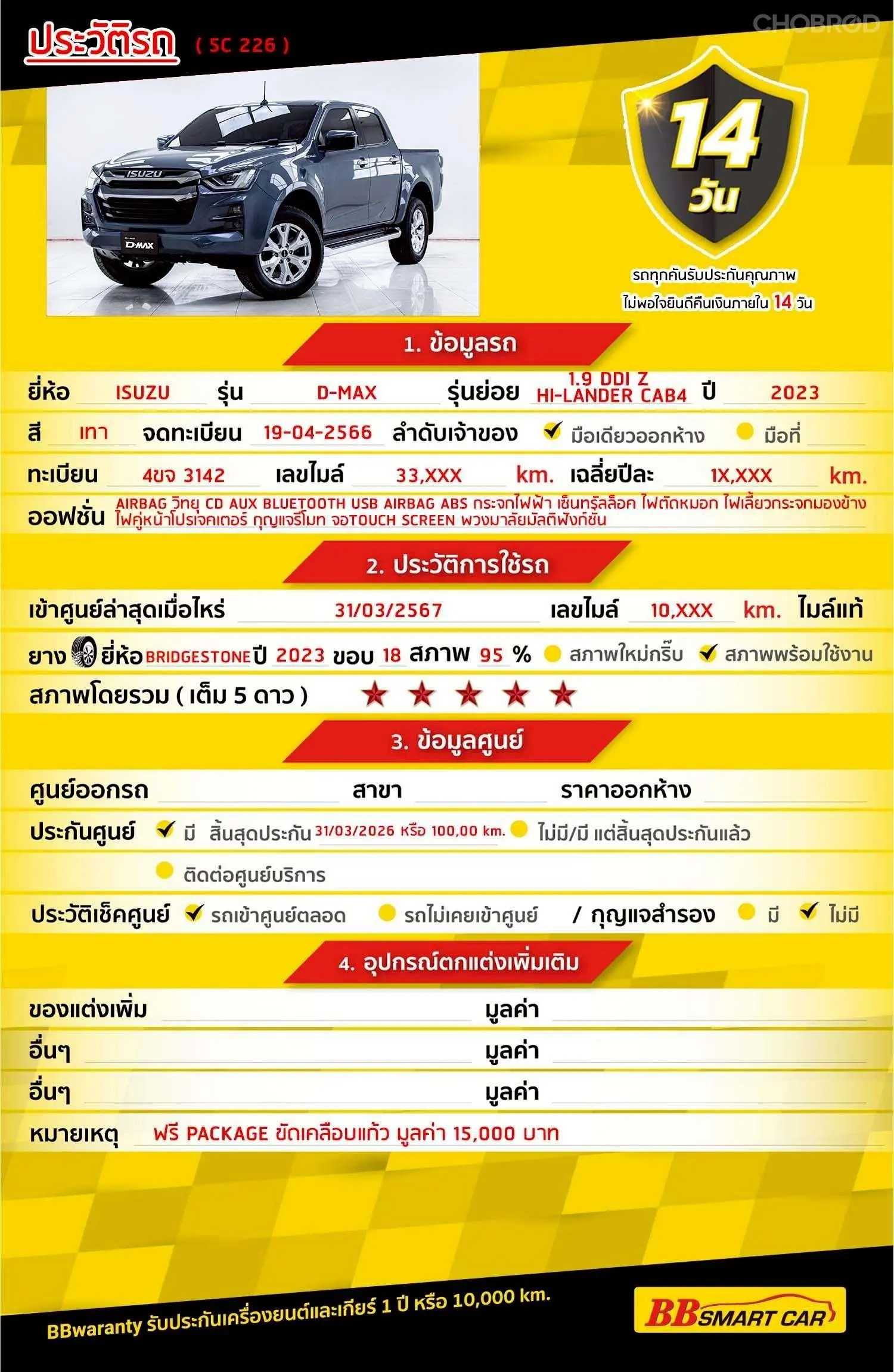 มีการรับประกันจากดีลเลอร์ (6 เดือน) มีบริการช่วยเหลือฉุกเฉินบนท้องถนน 24 ชม. จากดีลเลอร์