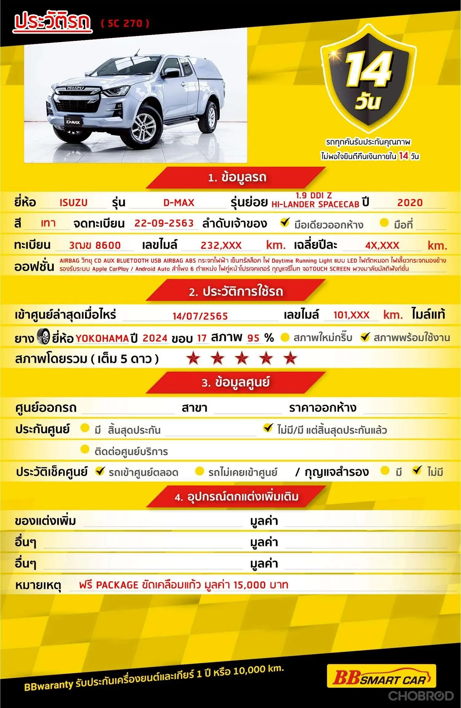 มีการรับประกันจากดีลเลอร์ (6 เดือน) มีบริการช่วยเหลือฉุกเฉินบนท้องถนน 24 ชม. จากดีลเลอร์