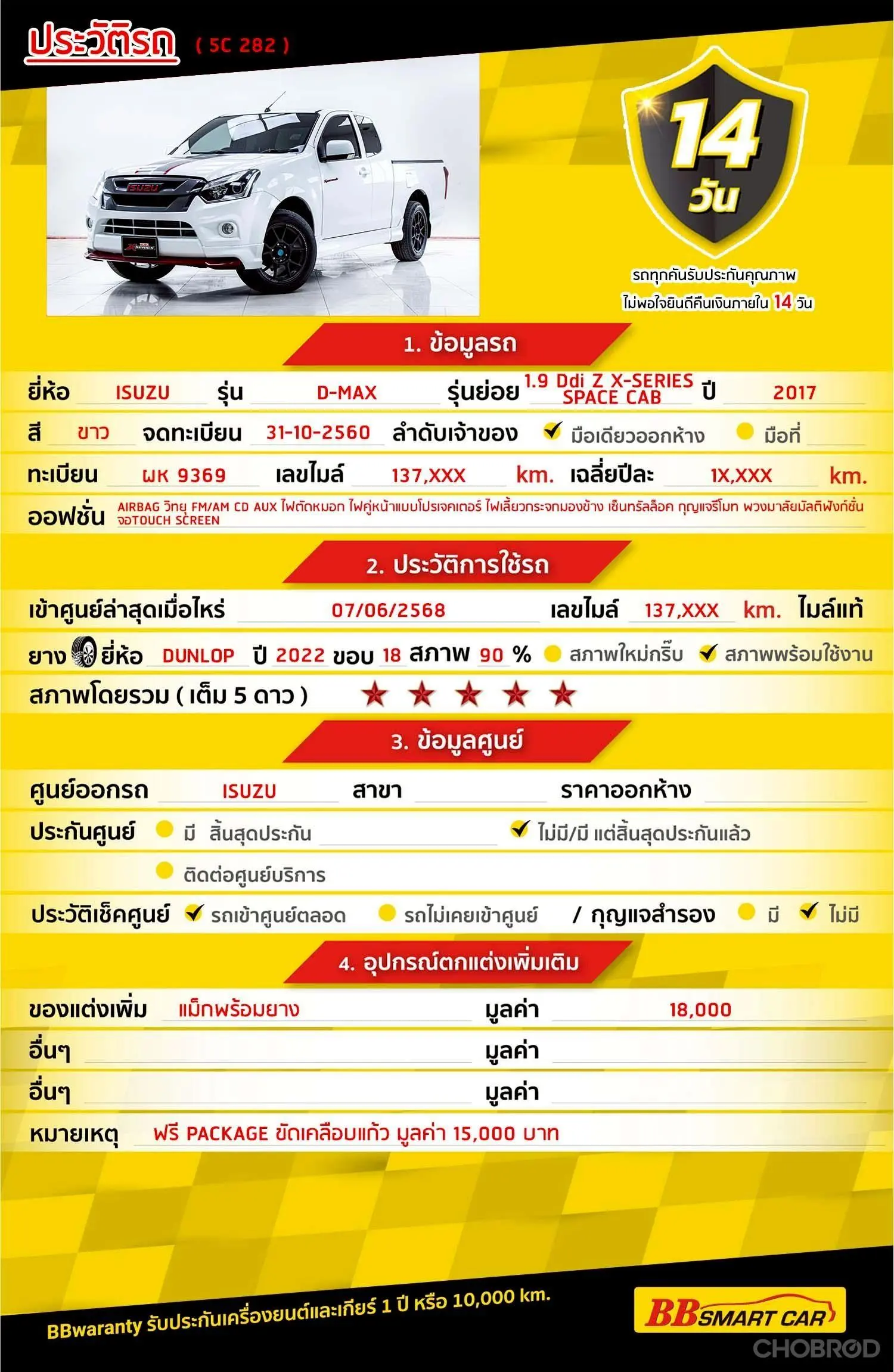 ISUZU D-MAX 1.9 Ddi Z X-series SPACECAB MT 2017 ออกรถ 0 บาท จัดได้ 409,000 บ. Line:@*******แสดงข้อมูล 🔥จอง 199 บาท ส่งบัตรประชาชน รู้ผลพิจารณาภายใน 30 นาที ไม่ผ่านคืนเงินจองทุกกรณี 🔥ซื้อรถกับ BB พร้อมให้คำปรึกษา แก้ทุกปัญหา ให้ทุกเรื่อง บริการ call center 24 ชม. 🔥BB Care Plus รับประกันหลังการขาย สูงสุด 2 ปี หรือ 20,000 km. 🔥มีรถให้เลือกมากกว่า 1,800 คัน สาขา5 ถ.เศรษฐกิจ ใกล้โลตัสมหาชัย รหัสรถ 5C282 ราคา 389,000 บาท ผ่อนเพียง 6,847 บาท Brand. : ISUZU Year. : 2017 Model. : D-MAX Grade. : 1.9 Ddi Z X-series SPACECAB Engine.: 1900 CC Type. : ดีเซล Gearbox : M/T Color. : ขาว Mileage. : 137,XXX km. (ซื้อสด ราคานี้ยังไม่รวมค่าดำเนินการ 10,000 บ.) 🚩 Price. 389,000 บาท ยอดจัด : 399,000 บาท เงินดาวน์ : 0 บาท ประกันภัย : ฟรีประกันภัย 1 ปี ค่าดำเนินการ : 10,000 บาท รวมออกรถ : 0 บาท ผ่อน36= 13,174 บาท ผ่อน48 = 10,135 บาท ผ่อน60 = 8,421 บาท ผ่อน72 = 7,533 บาท ผ่อน84 = 6,847 บาท เงื่อนไขเป็นไปตามที่ไฟแนนซ์กำหนด** 📍36 งวด = 1.29 % 📍48 งวด = 1.99 % 📍60 งวด = 2.39 % 📍72 งวด = 3.59 % 🔥เงื่อนไข โปรโมชั่น ดอกเบี้ยเริ่มต้น 1.29% ตลอดอายุสัญญา - ยอดจัดไฟแนนซ์ 300,000-600,000 บาท - ผ่อนสูงสุด 72 เดือน - เป็นลูกค้าประวัติดี พนักงานประจำเงินเดือน 20,000 ขึ้นไป - ค่าดำเนินการแคมเปญ 20,000 บาท (รวมในยอดจัดได้) 🎗Car Hightlight รถสวยๆ ISUZU D-MAX 1.9 Ddi Z X-series SPACECAB 2017 1.พวงมาลัย Multifunction 2.ชุดแต่งสเกิร์ตรอบคัน 3.ล้อแม็ก 🎗ภายใน กระจกมองข้างปรับไฟฟ้า Airbag วิทยุ - CD เบาะหนัง เซ็นทรัลล๊อก จอ LCD เล่น DVD เบรค ABS พวงมาลัย Multifunction กระจกไฟฟ้า กุญแจรีโมท-สัญญานกันขโมย แอร์ 🎗ภายนอก. ตัวรถสีขาว ไฟเลี้ยวกระจกมองข้าง ไฟตัดหมอก คิ้วกันสาด ชุดแต่งสเกิร์ตรอบคัน ไฟโปรเจคเตอร์ ล้อแม็ก กระจกมองข้างพับไฟฟ้า 🎗ความคุ้มค่า สำหรับคันนี้หากเปรียบเทียบราคากับคุณภาพ ถือว่าคุ้มค่ามากครับ ผ่อนสบายๆก็มีรถขับได้ รถดีมีคุณภาพแบบนี้รีบตัดสินใจซื้อได้เลย ราคานี้มาไวไปไวนะคะ ⭐️การรับประกันหลังการขาย BB Care Plus สูงสุด 2 ปี หรือ 20,000 km. ด้วยช่างที่ผ่านการอบรมจากศูนย์ชั้นนำของประเทศ 🎉Special offer เฉพาะ บีบีสมาร์ทคาร์ ที่นี่ที่เดียว ⭐ดอกเบี้ยเริ่มต้น 1.29% มีไฟแนนซ์รองรับหลายที่ค่ะ ⭐ฟรี!! แพคเก็จ ขัดเคลือบแก้ว มูลค่า 15,000 บาท ทุกคัน ⭐อนุมัติไว 30 นาที นำเอกสารมาให้ครบรับรถกลับบ้านทันทีค่ะ ⭐BB Care Plus รับประกันหลังการขาย สูงสุด 2 ปี หรือ 20,000 km. ⭐มี 6 สาขา ในกรุงเทพและปริมณฑลใกล้บ้านท่าน ⭐รถทุกคันผ่านตรวจสอบ Inspection เรียบร้อยแล้วค่ะ ผ่าน 5 ดาวทุกคันค่ะ ⭐เซลล์ทุกท่านเป็นมืออาชีพพร้อมให้บริการทุกท่านแน่นอนค่ะ