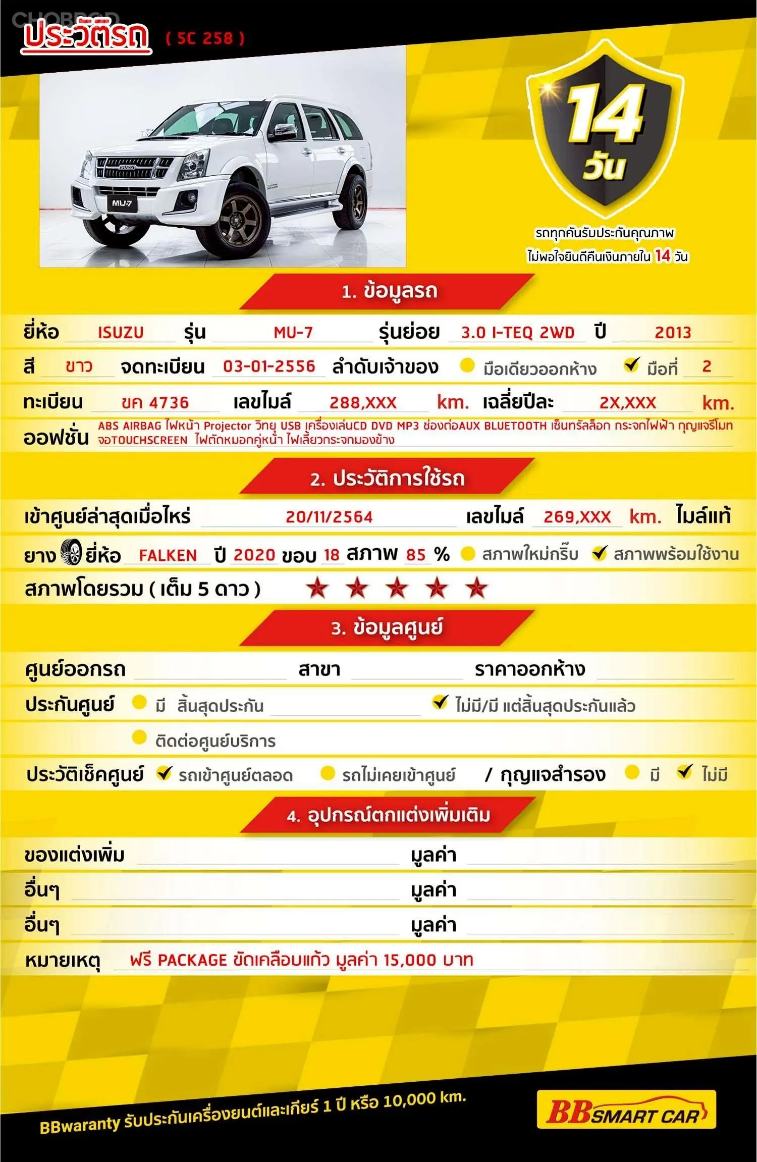 5C258 รถมือสอง ISUZU MU-7 3.0 2013 สภาพดี ราคาถูก