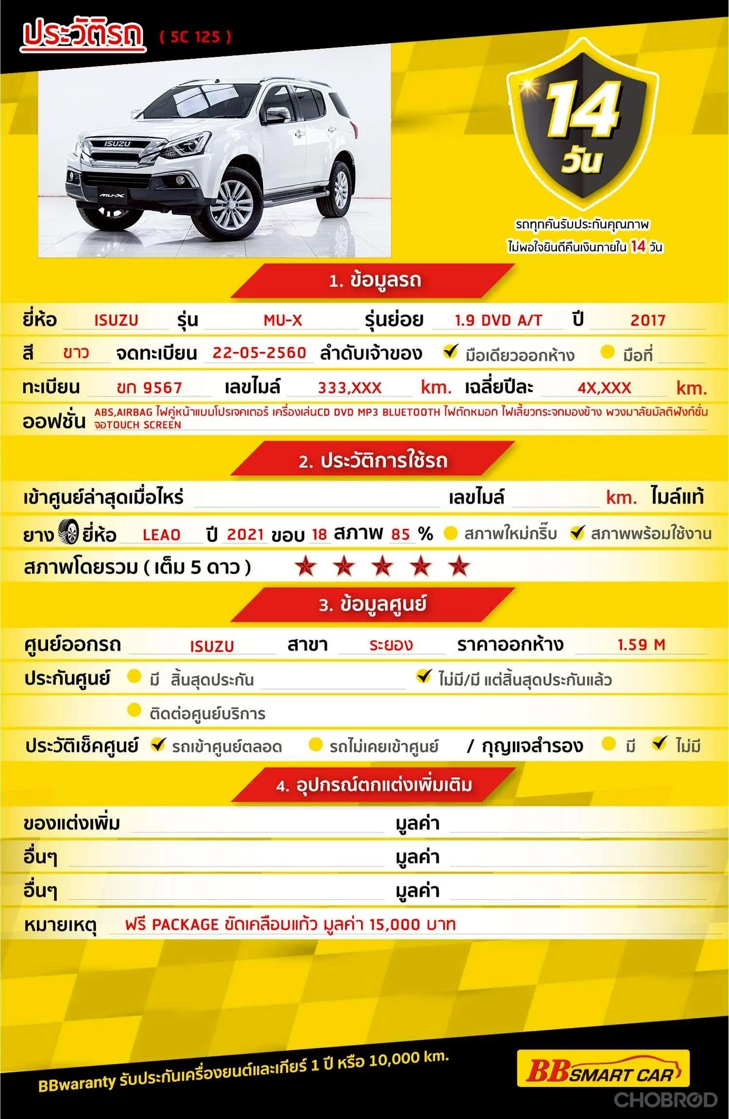 ISUZU MU-X 1.9 DVD AT 2017 ออกรถ 0 บาท จัดได้ 574,000 บ. Line:********แสดงข้อมูล 🔥จอง 199 บาท ส่งบัตรประชาชน รู้ผลพิจารณาภายใน 30 นาที ไม่ผ่านคืนเงินจองทุกกรณี 🔥ซื้อรถกับ BB พร้อมให้คำปรึกษา แก้ทุกปัญหา ให้ทุกเรื่อง บริการ call center 24 ชม. 🔥BB Care Plus รับประกันหลังการขาย สูงสุด 2 ปี หรือ 20,000 km. 🔥มีรถให้เลือกมากกว่า 1,600 คัน สาขา5 ถ.เศรษฐกิจ ใกล้โลตัสมหาชัย รหัสรถ 5C125 ราคา 554,000 บาท ผ่อนเพียง 9,526 บาท Brand. : ISUZU Year. : 2017 Model. : MU-X Grade. : 1.9 DVD Engine. : 1900 CC Type. : ดีเซล Gearbox : A/T Color. : ขาว Mileage. : 333,XXX KM. (ซื้อสด ราคานี้ยังไม่รวมค่าดำเนินการ 10,000 บ.) 🚩 Price. 554,000 บาท ยอดจัด : 564,000 บาท เงินดาวน์ : 0 บาท ประกันภัย : ฟรีประกันภัย 1 ปี ค่าดำเนินการ : 10,000 บาท รวมออกรถ : 0 บาท ผ่อน 36 งวด = 18,327 บาท ผ่อน 48 งวด = 14,099 บาท ผ่อน 60 งวด = 11,715 บาท ผ่อน 72 งวด = 10,481 บาท ผ่อน 84 งวด = 9,526 บาท เงื่อนไขเป็นไปตามที่ไฟแนนซ์กำหนด โปรโมชั่นพิเศษ สำหรับลูกค้าเครดิตดีลือกรับเรทดอกเบี้ยพิเศษ 📍36 งวด = 1.29 % 📍48 งวด = 1.99 % 📍60 งวด = 2.39 % 📍72 งวด = 3.59 % 🔥เงื่อนไข โปรโมชั่น ดอกเบี้ยเริ่มต้น 1.29% ตลอดอายุสัญญา - ยอดจัดไฟแนนซ์ 300,000-600,000 บาท - ผ่อนสูงสุด 72 เดือน - เป็นลูกค้าประวัติดี พนักงานประจำเงินเดือน 20,000 ขึ้นไป - ค่าดำเนินการแคมเปญ 20,000 บาท (รวมในยอดจัดได้) 🎗Car Hightlight ISUZU MU-X 1.9 DVD AT ดีเซล จุดเด่นออฟชั่น 1 : ไฟตัดหมอก 2 : กระจกมองข้างปรับไฟฟ้า 3 : พวงมาลัย Multifunction 🎗ภายใน กระจกมองข้างปรับไฟฟ้า กุญแจรีโมท-สัญญานกันขโมย Airbag วิทยุ - CD แอร์ พวงมาลัย Multifunction จอ LCD เล่น DVD เบรค ABS กระจกไฟฟ้า เซ็นทรัลล๊อก 🎗ภายนอก บันไดข้าง ไฟเลี้ยวกระจกมองข้าง แล็คหลังคา ไฟตัดหมอก คิ้วกันสาด กระจกมองข้างพับไฟฟ้า ไฟโปรเจคเตอร์ 🎗ความคุ้มค่า สำหรับคันนี้หากเปรียบเทียบราคากับคุณภาพ คันนี้ถือว่าคุ้มค่ามากค่ะ ผ่อนสบายๆก็มีรถขับได้ รถดีมีคุณภาพแบบนี้รีบตัดสินใจซื้อได้เลราคานี้มาไวไปไวนะคะ ⭐️การรับประกันหลังการขาย BB Care Plus สูงสุด 2 ปี หรือ 20,000 km. ด้วยช่างที่ผ่านการอบรมจากศูนย์ชั้นนำของประเทศ 🎉Special offer เฉพาะ บีบีสมาร์ทคาร์ ที่นี่ที่เดียว ⭐ดอกเบี้ยเริ่มต้น 1.29% มีไฟแนนซ์รองรับหลายที่ค่ะ ⭐ฟรี!! แพคเก็จ ขัดเคลือบแก้ว มูลค่า 15,000 บาท ทุกคัน ⭐อนุมัติไว 30 นาที นำเอกสารมาให้ครบรับรถกลับบ้านทันทีค่ะ ⭐BB Care Plus รับประกันหลังการขาย สูงสุด 2 ปี หรือ 20,000 km. ⭐มี 6 สาขา ในกรุงเทพและปริมณฑลใกล้บ้านท่าน ⭐รถทุกคันผ่านตรวจสอบ Inspection เรียบร้อยแล้วค่ะ ผ่าน 5 ดาวทุกคันค่ะ ⭐เซลล์ทุกท่านเป็นมืออาชี