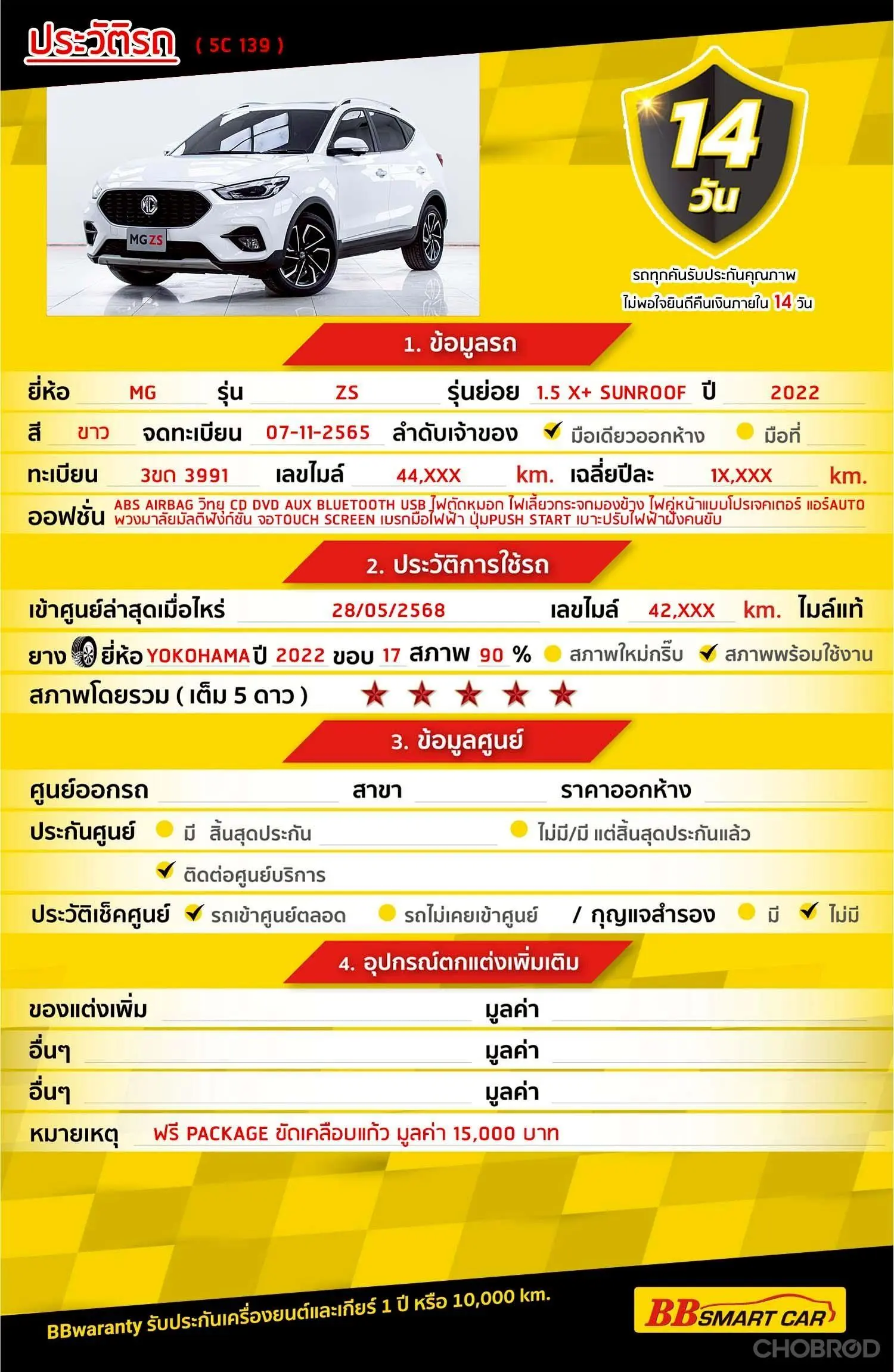 MG ZS 1.5 X+ SUNROOF AT 2022 ออกรถ 0 บาท จัดได้ 429,000 บ. Line:@*******แสดงข้อมูล 🔥จอง 199 บาท ส่งบัตรประชาชน รู้ผลพิจารณาภายใน 30 นาที ไม่ผ่านคืนเงินจองทุกกรณี 🔥ซื้อรถกับ BB พร้อมให้คำปรึกษา แก้ทุกปัญหา ให้ทุกเรื่อง บริการ call center 24 ชม. 🔥BB Care Plus รับประกันหลังการขาย สูงสุด 2 ปี หรือ 20,000 km. 🔥มีรถให้เลือกมากกว่า 1,600 คัน สาขา5 ถ.เศรษฐกิจ ใกล้โลตัสมหาชัย รหัสรถ 5C139 ราคา 409,000 บาท ผ่อนเพียง 7,015 บาท Brand. : MG Year. : 2023 Model. : ZS Grade. : 1.5 X+ SUNROOF Engine. : 1500 CC Type. : เบนซิน Gearbox : A/T Color. : ขาว Mileage. : 44,XXX KM. (ซื้อสด ราคานี้ยังไม่รวมค่าดำเนินการ 10,000 บ.) 🚩 Price. 409,000 บาท ยอดจัด : 419,000 บาท เงินดาวน์ : 0 บาท ประกันภัย : ฟรีประกันภัย 1 ปี ค่าดำเนินการ : 10,000 บาท รวมออกรถ : 0 บาท ผ่อน 36 งวด = 13,496 บาท ผ่อน 48 งวด = 10,382 บาท ผ่อน 60 งวด = 8,626 บาท ผ่อน 72 งวด = 7,718 บาท ผ่อน 84 งวด = 7,015 บาท เงื่อนไขเป็นไปตามที่ไฟแนนซ์กำหนด โปรโมชั่นพิเศษ สำหรับลูกค้าเครดิตดีลือกรับเรทดอกเบี้ยพิเศษ 📍36 งวด = 1.29 % 📍48 งวด = 1.99 % 📍60 งวด = 2.39 % 📍72 งวด = 3.59 % 🔥เงื่อนไข โปรโมชั่น ดอกเบี้ยเริ่มต้น 1.29% ตลอดอายุสัญญา - ยอดจัดไฟแนนซ์ 300,000-600,000 บาท - ผ่อนสูงสุด 72 เดือน - เป็นลูกค้าประวัติดี พนักงานประจำเงินเดือน 20,000 ขึ้นไป - ค่าดำเนินการแคมเปญ 20,000 บาท (รวมในยอดจัดได้) 🎗Car Hightlight รถสวยๆ วันนี้ขอแนะนำ MG ZS 1.5 X AT เบนซิน 2022 จุดเด่นออฟชั่น 1 : เบาะไฟฟ้าคนขับ 2 : เซนเซอร์รอบคัน 3 :จอ LCD เล่น DVD 🎗ภายใน Airbag เบาะไฟฟ้าคนขับ เบรค ABS กระจกมองข้างปรับไฟฟ้า พวงมาลัย Multifunction เบาะหนัง เซ็นทรัลล๊อก ไมล์ Digital วิทยุ - CD แอร์ AUTO กระจกไฟฟ้า เบรกมือไฟฟ้า จอ LCD เล่น DVD Navigator 🎗ภายนอก ตัวรถ สีขาว คิ้วกันสาด ไฟตัดหมอก ไฟเลี้ยวกระจกมองข้าง ไฟโปรเจคเตอร์ กระจกมองข้างพับไฟฟ้า แล็คหลังคา เซนเซอร์รอบคัน 🎗ความคุ้มค่า สำหรับคันนี้หากเปรียบเทียบราคากับคุณภาพ คันนี้ถือว่าคุ้มค่ามากค่ะ ผ่อนสบายๆก็มีรถขับได้ รถดีมีคุณภาพแบบนี้รีบตัดสินใจซื้อได้เลราคานี้มาไวไปไวนะคะ ⭐️การรับประกันหลังการขาย BB Care Plus สูงสุด 2 ปี หรือ 20,000 km. ด้วยช่างที่ผ่านการอบรมจากศูนย์ชั้นนำของประเทศ 🎉Special offer เฉพาะ บีบีสมาร์ทคาร์ ที่นี่ที่เดียว ⭐ดอกเบี้ยเริ่มต้น 1.29% มีไฟแนนซ์รองรับหลายที่ค่ะ ⭐ฟรี!! แพคเก็จ ขัดเคลือบแก้ว มูลค่า 15,000 บาท ทุกคัน ⭐อนุมัติไว 30 นาที นำเอกสารมาให้ครบรับรถกลับบ้านทันทีค่ะ ⭐BB Care Plus รับประกันหลังการขาย สูงสุด 2 ปี หรือ 20,000 km. ⭐มี 6 สาขา ในกรุงเทพและปริมณฑลใกล้บ้านท่าน ⭐รถทุกคันผ่านตรวจสอบ Inspection เรียบร้อยแล้วค่ะ ผ่าน 5 ดาวทุกคันค่ะ ⭐เซลล์ทุกท่านเป็นมืออาชีพพร้อมให้บริการทุกท่านแน่นอนค่ะ เลือกข้อเสนอที่ให้คุณมากกว่าที่อื่น เพราะเราเล็งเห็นแล้ว ที่บีบีสมาร์ทคาร์ ให้คุณได้มากกว่าที่อื่นแน่นอนครับ มาที่เดียวจบทุกปัญหา หลากหลายรุ่นให้เลือก