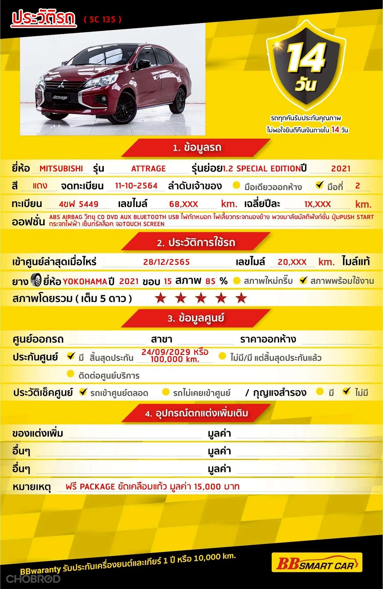 มีการรับประกันจากดีลเลอร์ (6 เดือน) มีบริการช่วยเหลือฉุกเฉินบนท้องถนน 24 ชม. จากดีลเลอร์