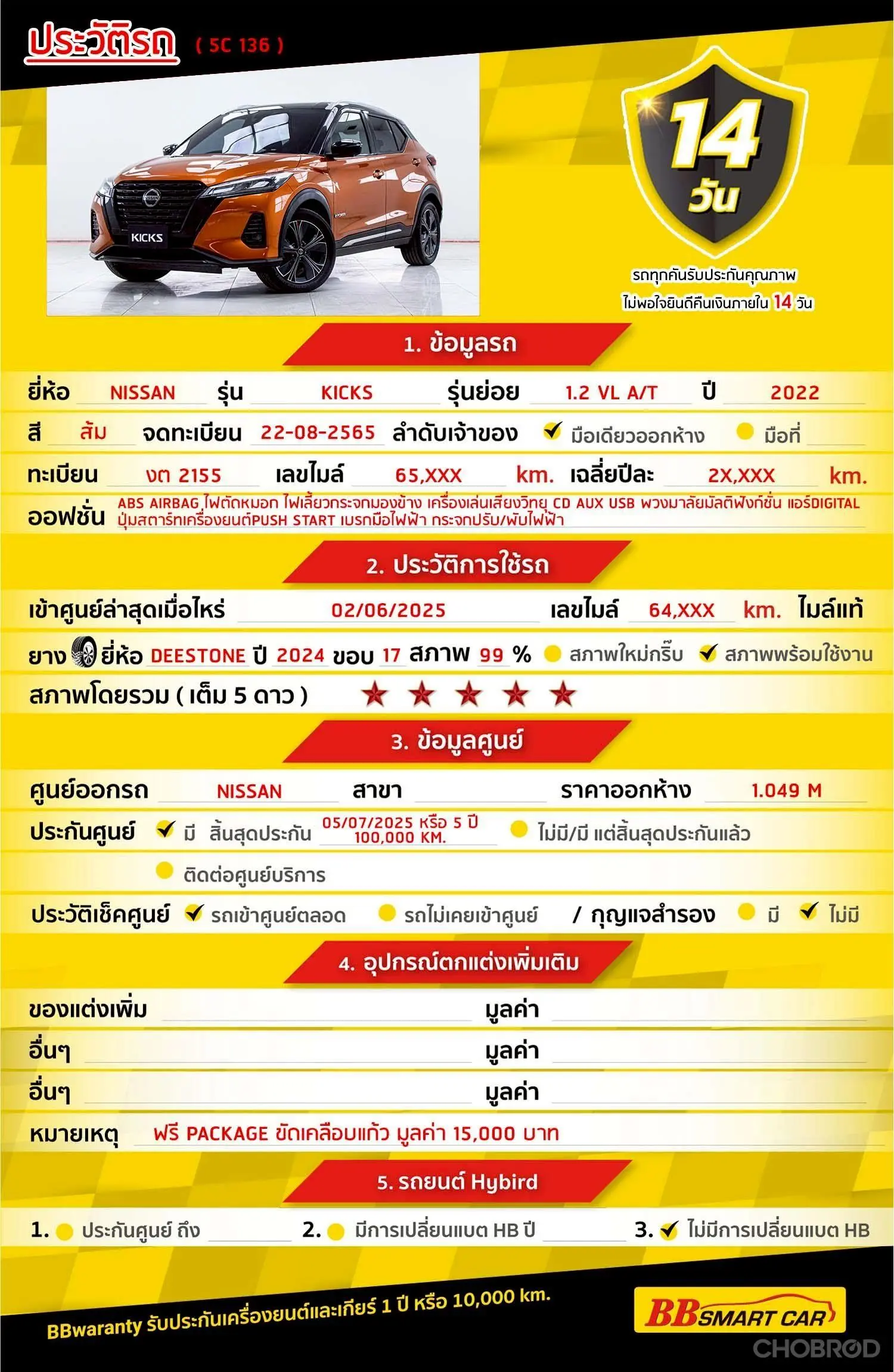 NISSAN KICKS 1.2 VL AT 2022 ออกรถ 0 บาท จัดได้ 509,000 บ. Line:@BBCAR05 🔥จอง 199 บาท ส่งบัตรประชาชน รู้ผลพิจารณาภายใน 30 นาที ไม่ผ่านคืนเงินจองทุกกรณี 🔥ซื้อรถกับ BB พร้อมให้คำปรึกษา แก้ทุกปัญหา ให้ทุกเรื่อง บริการ call center 24 ชม. 🔥BB Care Plus รับประกันหลังการขาย สูงสุด 2 ปี หรือ 20,000 km. 🔥มีรถให้เลือกมากกว่า 1,600 คัน สาขา5 ถ.เศรษฐกิจ ใกล้โลตัสมหาชัย รหัสรถ 5C136 ราคา 489,000 บาท ผ่อนเพียง 8,355 บาท Brand. : NISSAN Year. : 2022 Model. : KICKS Grade. : 1.2 VL Engine. : 1200 CC Type. : เบนซิน+ไฟฟ้า Gearbox : AT Color. : ส้ม Mileage. : 65,XXX KM. (ซื้อสด ราคานี้ยังไม่รวมค่าดำเนินการ 10,000 บ.) 🚩 Price. 489,000 บาท ยอดจัด : 499,000 บาท เงินดาวน์ : 0 บาท ประกันภัย : ฟรีประกันภัย 1 ปี ค่าดำเนินการ : 10,000 บาท รวมออกรถ : 0 บาท ผ่อน 36 งวด = 16,072 บาท ผ่อน 48 งวด = 12,365 บาท ผ่อน 60 งวด = 10,274 บาท ผ่อน 72 งวด = 9,191 บาท ผ่อน 84 งวด = 8,355 บาท เงื่อนไขเป็นไปตามที่ไฟแนนซ์กำหนด โปรโมชั่นพิเศษ สำหรับลูกค้าเครดิตดีลือกรับเรทดอกเบี้ยพิเศษ 📍36 งวด = 1.29 % 📍48 งวด = 1.99 % 📍60 งวด = 2.39 % 📍72 งวด = 3.59 % 🔥เงื่อนไข โปรโมชั่น ดอกเบี้ยเริ่มต้น 1.29% ตลอดอายุสัญญา - ยอดจัดไฟแนนซ์ 300,000-600,000 บาท - ผ่อนสูงสุด 72 เดือน - เป็นลูกค้าประวัติดี พนักงานประจำเงินเดือน 20,000 ขึ้นไป - ค่าดำเนินการแคมเปญ 20,000 บาท (รวมในยอดจัดได้) 🎗Car Hightlight NISSAN KICKS 1.2 V AT เบนซิน+ไฟฟ้า 2021 จุดเด่นออฟชั่น 1 : กระจกมองข้างปรับไฟฟ้า 2 : ไมล์ Digital 3 : กล้องส่องหลัง 🎗ภายใน พวงมาลัย Multifunction เบรค ABS กระจกมองข้างปรับไฟฟ้า แอร์ AUTO เซ็นทรัลล๊อก Airbag วิทยุ - CD เบรกมือไฟฟ้า เบาะหนัง จอ LCD เล่น DVD กระจกไฟฟ้า ไมล์ Digital 🎗ภายนอก ตัวรถสีส้ม มาพร้อม คิ้วกันสาด กล้องส่องหลัง กระจกมองข้างพับไฟฟ้า แล็คหลังคา ไฟเลี้ยวกระจกมองข้าง ไฟตัดหมอก 🎗ความคุ้มค่า สำหรับคันนี้หากเปรียบเทียบราคากับคุณภาพ คันนี้ถือว่าคุ้มค่ามากค่ะ ผ่อนสบายๆก็มีรถขับได้ รถดีมีคุณภาพแบบนี้รีบตัดสินใจซื้อได้เลราคานี้มาไวไปไวนะคะ ⭐️การรับประกันหลังการขาย BB Care Plus สูงสุด 2 ปี หรือ 20,000 km. ด้วยช่างที่ผ่านการอบรมจากศูนย์ชั้นนำของประเทศ 🎉Special offer เฉพาะ บีบีสมาร์ทคาร์ ที่นี่ที่เดียว ⭐ดอกเบี้ยเริ่มต้น 1.29% มีไฟแนนซ์รองรับหลายที่ค่ะ ⭐ฟรี!! แพคเก็จ ขัดเคลือบแก้ว มูลค่า 15,000 บาท ทุกคัน ⭐อนุมัติไว 30 นาที นำเอกสารมาให้ครบรับรถกลับบ้านทันทีค่ะ ⭐BB Care Plus รับประกันหลังการขาย สูงสุด 2 ปี หรือ 20,000 km. ⭐มี 6 สาขา ในกรุงเทพและปริมณฑลใกล้บ้านท่าน ⭐รถทุกคันผ่านตรวจสอบ Inspection เรียบร้อยแล้วค่ะ ผ่าน 5 ดาวทุกคันค่ะ ⭐เซลล์ทุกท่านเป็นมืออาชีพพร้อมให้บริการทุกท่านแน่นอนค่ะ
