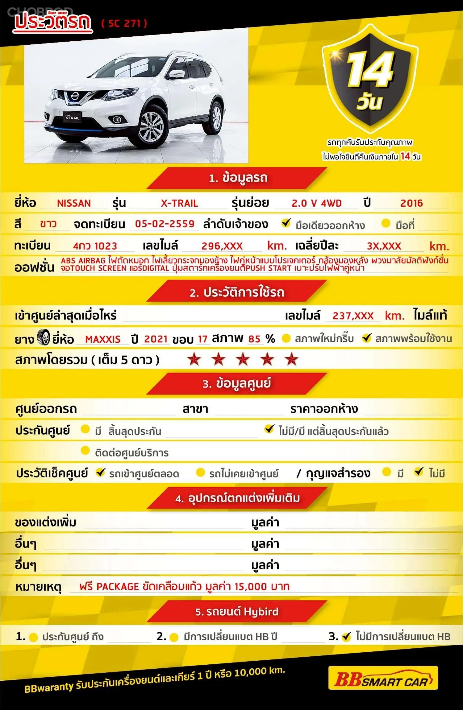 NISSAN X-TRAIL 2.0 V 4WD AT 2016 ออกรถ 0 บาท จัดได้ 319,000 บ. Line:@*******แสดงข้อมูล 🔥จอง 199 บาท ส่งบัตรประชาชน รู้ผลพิจารณาภายใน 30 นาที ไม่ผ่านคืนเงินจองทุกกรณี 🔥ซื้อรถกับ BB พร้อมให้คำปรึกษา แก้ทุกปัญหา ให้ทุกเรื่อง บริการ call center 24 ชม. 🔥BB Care Plus รับประกันหลังการขาย สูงสุด 2 ปี หรือ 20,000 km. 🔥มีรถให้เลือกมากกว่า 1,800 คัน สาขา5 ถ.เศรษฐกิจ ใกล้โลตัสมหาชัย รหัสรถ 5C271 ราคา 299,000 บาท ผ่อนเพียง 6,099 บาท Brand. : NISSAN Year. : 2016 Model. : X-TRAIL Grade. : 2.0 V 4WD Engine. : 2000 CC Type. : เบนซิน+ไฟฟ้า Gearbox : A/T Color. : ขาว Mileage. : 296,XXX KM. (ซื้อสด ราคานี้ยังไม่รวมค่าดำเนินการ 10,000 บ.) 🚩 Price. 299,000 บาท ยอดจัด : 309,000 บาท เงินดาวน์ : 0 บาท ประกันภัย : ฟรีประกันภัย 1 ปี ค่าดำเนินการ : 10,000 บาท รวมออกรถ : 0 บาท ผ่อน36= 11,252 บาท ผ่อน48 = 8,732 บาท ผ่อน60 = 7,281 บาท ผ่อน72 = 6,546 บาท ผ่อน84 = 6,099 บาท เงื่อนไขเป็นไปตามที่ไฟแนนซ์กำหนด โปรโมชั่นพิเศษ สำหรับลูกค้าเครดิตดีเลือกรับเรทดอกเบี้ยพิเศษ 📍36 งวด = 1.29 % 📍48 งวด = 1.99 % 📍60 งวด = 2.39 % 📍72 งวด = 3.59 % 🔥เงื่อนไข โปรโมชั่น ดอกเบี้ยเริ่มต้น 1.29% ตลอดอายุสัญญา - ยอดจัดไฟแนนซ์ 300,000-600,000 บาท - ผ่อนสูงสุด 72 เดือน - เป็นลูกค้าประวัติดี พนักงานประจำเงินเดือน 20,000 ขึ้นไป - ค่าดำเนินการแคมเปญ 20,000 บาท (รวมในยอดจัดได้) 🎗Car Hightlight รถสวยๆ วันนี้ขอแนะนำ NISSAN X-TRAIL 2.0 V 4WD จุดเด่นออฟชั่น 1 : พวงมาลัย Multifunction 3 : เบาะไฟฟ้าคู่หน้า 3 : แล็คหลังคา 🎗ภายใน วิทยุ - CD เบาะหนัง Airbag Navigator กระจกมองข้างปรับไฟฟ้า จอ LCD เล่น DVD กระจกไฟฟ้า เบาะไฟฟ้าคู่หน้า เซ็นทรัลล๊อก แอร์ AUTO เบรค ABS พวงมาลัย Multifunction 🎗ภายนอก ไฟโปรเจคเตอร์ ไฟเลี้ยวกระจกมองข้าง แล็คหลังคา กระจกมองข้างพับไฟฟ้า ไฟตัดหมอก 🎗ความคุ้มค่า สำหรับคันนี้หากเปรียบเทียบราคากับคุณภาพ คันนี้ถือว่าคุ้มค่ามากค่ะ ผ่อนสบายๆก็มีรถขับได้ รถดีมีคุณภาพแบบนี้รีบตัดสินใจซื้อได้เลราคานี้มาไวไปไวนะคะ ⭐️การรับประกันหลังการขาย BB Care Plus สูงสุด 2 ปี หรือ 20,000 km. ด้วยช่างที่ผ่านการอบรมจากศูนย์ชั้นนำของประเทศ 🎉Special offer เฉพาะ บีบีสมาร์ทคาร์ ที่นี่ที่เดียว ⭐ดอกเบี้ยเริ่มต้น 1.29% มีไฟแนนซ์รองรับหลายที่ค่ะ ⭐ฟรี!! แพคเก็จ ขัดเคลือบแก้ว มูลค่า 15,000 บาท ทุกคัน ⭐อนุมัติไว 30 นาที นำเอกสารมาให้ครบรับรถกลับบ้านทันทีค่ะ ⭐BB Care Plus รับประกันหลังการขาย สูงสุด 2 ปี หรือ 20,000 km. ⭐มี 6 สาขา ในกรุงเทพและปริมณฑลใกล้บ้านท่าน ⭐รถทุกคันผ่านตรวจสอบ Inspection เรียบร้อยแล้วค่ะ ผ่าน 5 ดาวทุกคันค่ะ ⭐เซลล์ทุกท่านเป็นมืออาชีพพร้อมให้บริการทุกท่านแน่นอนค่ะ