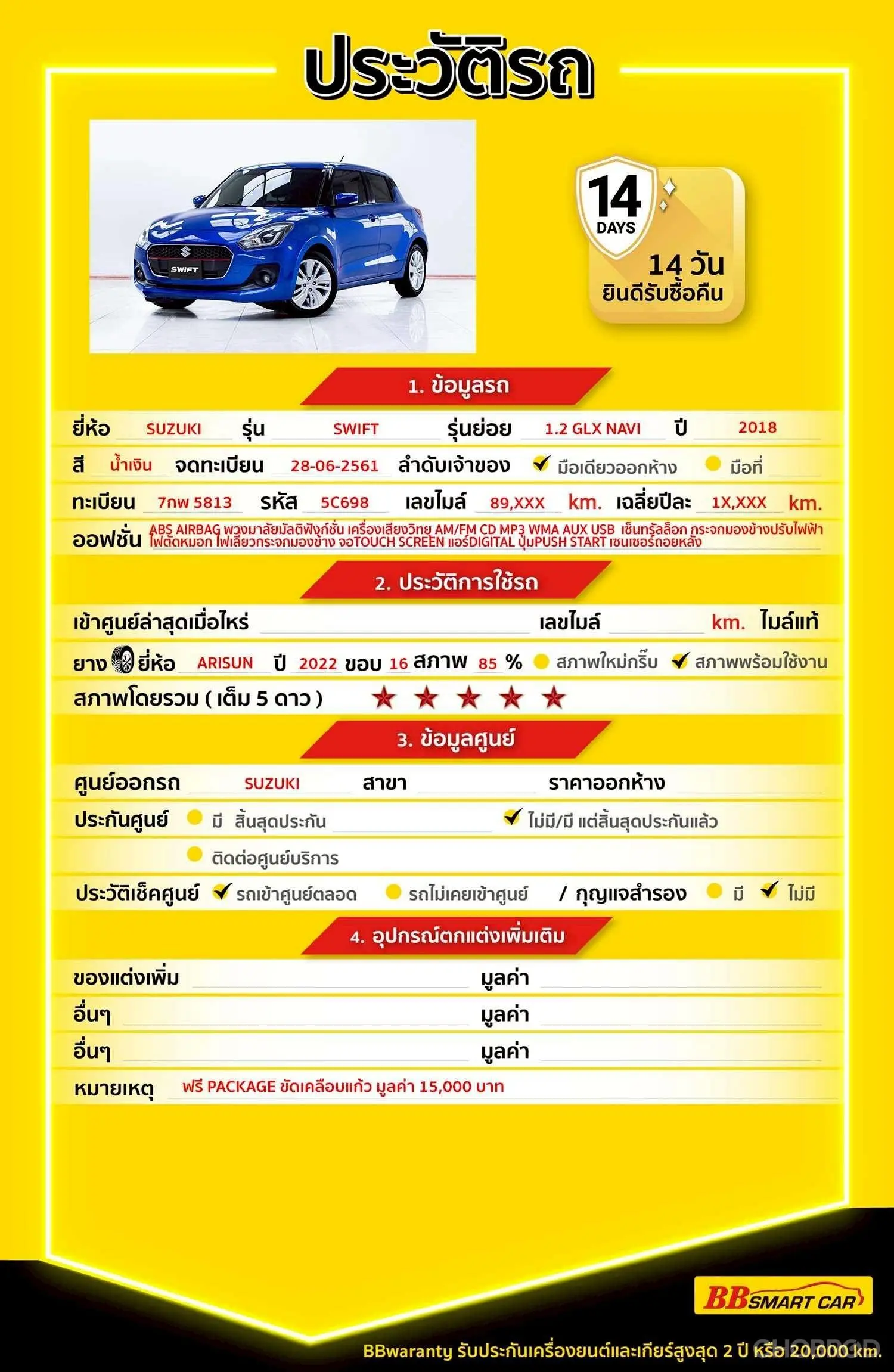 SUZUKI SWIFT 1.2 GLX Navi AT 2018 ออกรถ 0 บาท รหัสรถ 5C698 Line: ID @BBCAR05 🔥มีรถให้เลือกมากกว่า 1,800 คัน 🔥รถทุกคันผ่านตรวจสอบ Inspection เรียบแล้วค่ะ ผ่าน 5 ดาวทุกคันค่ะ 🔥ซื้อรถกับ BB พร้อมให้คำปรึกษา แก้ทุกปัญหา ให้ทุกเรื่อง บริการ call center 24 ชม. 🔥BB Care Plus รับประกันหลังการขาย สูงสุด 2 ปี หรือ 20,000 km. 🔥ฟรี!! แพคเก็จ ขัดเคลือบแก้ว มูลค่า 15,000 บาท ทุกคัน 🔥มี 6 สาขา ในกรุงเทพและปริมณฑลใกล้บ้านท่าน สาขา5 ถ.เศรษฐกิจ ใกล้โลตัสมหาชัย รหัสรถ 5C698 ราคา 299,000 บ. ผ่อนเพียง 5,727 บ. Brand. : SUZUKI Year. : 2018 Model. : SWIFT Grade. : 1.2 GLX Navi Engine. : 1200 CC. Type. : เบนซิน Gearbox. : A/T Color. : น้ำเงิน Mileage. : 89,xxx km. (ซื้อสด ราคานี้ยังไม่รวมค่าดำเนินการ 10,000 บ.) 🚩 Price. 299,000 บาท ยอดจัด : 309,000 บาท เงินดาวน์. : 0 บาท ประกันภัย : ฟรีประกันภัย 1 ปี ค่าดำเนินการ : 10,000 บาท รวมออกรถ 0 บาท ผ่อน36= 10,217 บาท ผ่อน48 = 7,921 บาท ผ่อน60 = 6,889 บาท ผ่อน72 = 6,108 บาท ผ่อน84 = 5,727 บาท เงื่อนไขเป็นไปตามที่ไฟแนนซ์กำหนด** โปรโมชั่นพิเศษ สำหรับลูกค้าเครดิตดี 🚩เลือกรับเรทดอกเบี้ยพิเศษ 📍36 งวด = 1.29 % 📍48 งวด = 1.99 % 📍60 งวด = 2.39 % 📍72 งวด = 3.59 % 🔥เงื่อนไข โปรโมชั่น ดอกเบี้ยเริ่มต้น 1.29% ตลอดอายุสัญญา - ยอดจัดไฟแนนซ์ 300,000-600,0000 บาท - ผ่อนสูงสุด 72 เดือน - เป็นลูกค้าประวัติดี พนักงานประจำเงินเดือน 20,000 ขึ้นไป - ค่าดำเนินการแคมเปญ 20,000 บาท (รวมในยอดจัดได้) 🎗Car Hightlight !!! SUZUKI SWIFT ด้วยดีไซน์สปอร์ตที่โดดเด่น และด้วยสมรรถนะที่มาพร้อมความปลอดภัย มั่นใจในทุกการขับขี่ บวกกับช่วยในเรื่องการประหยัดน้ำมัน และประหยัดพื้นที่ในการจอด 🎗ภายใน.ภายในห้องโดยสารให้มีความหรูหรามีสไตล์ ควบคู่ไปกับความสะดวกสบาย ด้วยการออกแบบ วิทยุ - CD จอ LCD เล่น DVD Airbag เบาะผ้า เซ็นทรัลล๊อก พวงมาลัย Multifunction กระจกไฟฟ้า แอร์ AUTO กระจกมองข้างปรับไฟฟ้า เบรค ABS 🎗ภายนอก.มาพร้อมการดีไซน์แบบสปอร์ตเต็มรูปแบบ ด้วยโครงสร้างที่โค้งมน ตัวรถสีน้ำเงิน เซนเซอร์ถอยหลัง ไฟเลี้ยวกระจกมองข้าง กระจกมองข้างพับไฟฟ้า คิ้วกันสาด ไฟตัดหมอก 🎗ความคุ้มค่า สำหรับใครที่กำลังมองหารถใหม่ลองเข้ามาดู ประหยัดเงินไปเยอะมาก ใช้งานสะดวกสบาย ประหยัดน้ำมันมากๆ เทียบกับราคานี้ถือว่าคุ้มค่ามากๆ กำลังเครื่องดี ดูแลง่าย สำหรับรถคันนี้แล้วรับรองไม่ผิดหวังแน่นอนค่ะ