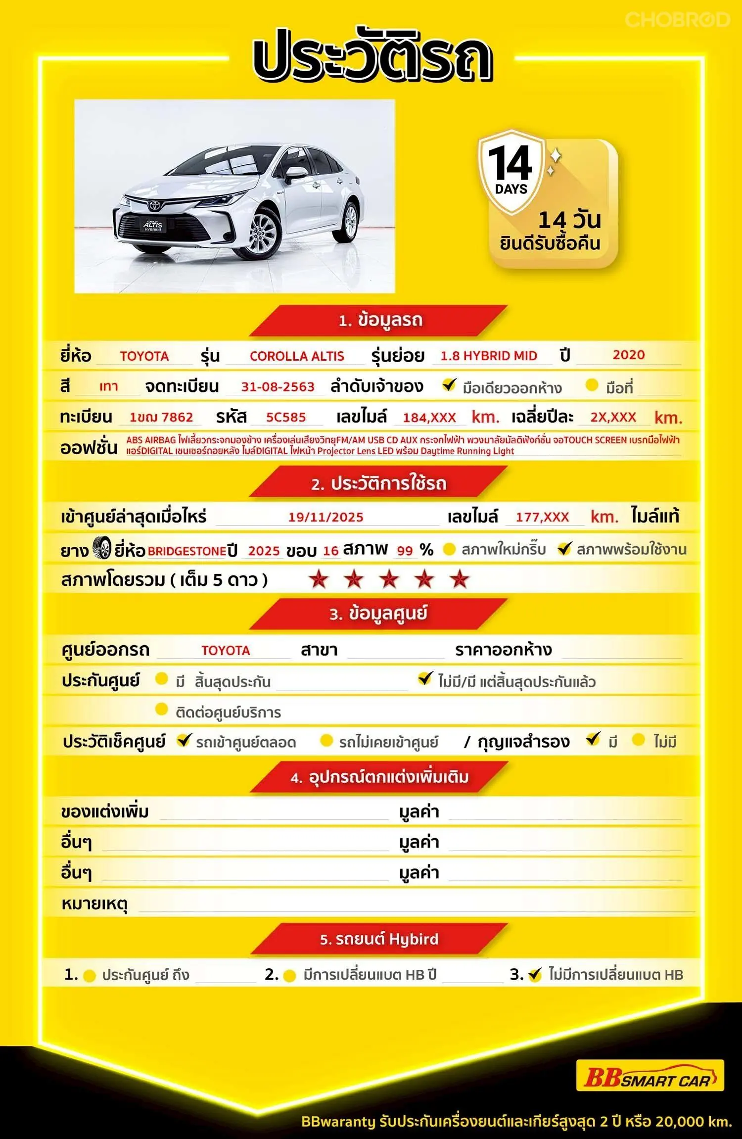 TOYOTA ALTIS 1.8 HYBRID MID AT 2020 ออกรถ 0 บาท รหัสรถ 5C585 Line: ID @BBCAR05 🔥มีรถให้เลือกมากกว่า 1,800 คัน 🔥รถทุกคันผ่านตรวจสอบ Inspection เรียบแล้วค่ะ ผ่าน 5 ดาวทุกคันค่ะ 🔥ซื้อรถกับ BB พร้อมให้คำปรึกษา แก้ทุกปัญหา ให้ทุกเรื่อง บริการ call center 24 ชม. 🔥BB Care Plus รับประกันหลังการขาย สูงสุด 2 ปี หรือ 20,000 km. 🔥ฟรี!! แพคเก็จ ขัดเคลือบแก้ว มูลค่า 15,000 บาท ทุกคัน 🔥มี 6 สาขา ในกรุงเทพและปริมณฑลใกล้บ้านท่าน สาขา5 ถ.เศรษฐกิจ ใกล้โลตัสมหาชัย รหัสรถ 5C585 ราคา 459,000 บาท ผ่อนเพียง 7,852 บาท Brand. : TOYOTA Year. : 2020 Model. : ALTIS Grade. : 1.8 HYBRID MID Engine. : 1800 CC Type. : เบนซิน+ระบบไฟฟ้า Gearbox : AT Color. : สีเทา Mileage. : 184,XXX KM. (ซื้อสด ราคานี้ยังไม่รวมค่าดำเนินการ 10,000 บ.) 🚩 Price. 459,000 บาท ยอดจัด : 469,000 บาท เงินดาวน์ : 0 บาท ประกันภัย : ฟรีประกันภัย 1 ปี ค่าดำเนินการ : 10,000 บาท รวมออกรถ : 0 บาท ผ่อน 36 งวด = 15,106 บาท ผ่อน 48 งวด = 11,621 บาท ผ่อน 60 งวด = 9,656 บาท ผ่อน 72 งวด = 8,638 บาท ผ่อน 84 งวด = 7,852 บาท เงื่อนไขเป็นไปตามที่ไฟแนนซ์กำหนด โปรโมชั่นพิเศษ สำหรับลูกค้าเครดิตดีลือกรับเรทดอกเบี้ยพิเศษ 📍36 งวด = 1.29 % 📍48 งวด = 1.99 % 📍60 งวด = 2.39 % 📍72 งวด = 3.59 % 🔥เงื่อนไข โปรโมชั่น ดอกเบี้ยเริ่มต้น 1.29% ตลอดอายุสัญญา - ยอดจัดไฟแนนซ์ 300,000-600,000 บาท - ผ่อนสูงสุด 72 เดือน - เป็นลูกค้าประวัติดี พนักงานประจำเงินเดือน 20,000 ขึ้นไป - ค่าดำเนินการแคมเปญ 20,000 บาท (รวมในยอดจัดได้) 🎗Car Hightlight รถสวยๆ วันนี้ขอแนะนำ TOYOTA ALTIS 1.8 HYBRID MID AT เชื้อเพลิงเบนซิน+ไฟฟ้า สีเทา จุดเด่นออฟชั่น 1.เบาะไฟฟ้าคนขับ 2.เซนเซอร์ถอยหลัง 🎗ภายใน ไมล์ Digital เบาะไฟฟ้าคนขับ กระจกมองข้างปรับไฟฟ้า เบรกมือไฟฟ้า วิทยุ - CD เบรค ABS แอร์ AUTO Airbag พวงมาลัย Multifunction เบาะหนัง เซ็นทรัลล๊อก กระจกไฟฟ้า 🎗ภายนอก ตัวรถสีเทา มาพร้อม เซนเซอร์ถอยหลัง กระจกมองข้างพับไฟฟ้า ไฟโปรเจคเตอร์ 🎗ความคุ้มค่า สำหรับคันนี้หากเปรียบเทียบราคากับคุณภาพ คันนี้ถือว่าคุ้มค่ามากค่ะ ผ่อนสบายๆก็มีรถขับได้ รถดีมีคุณภาพแบบนี้รีบตัดสินใจซื้อได้เลราคานี้มาไวไปไวนะคะ