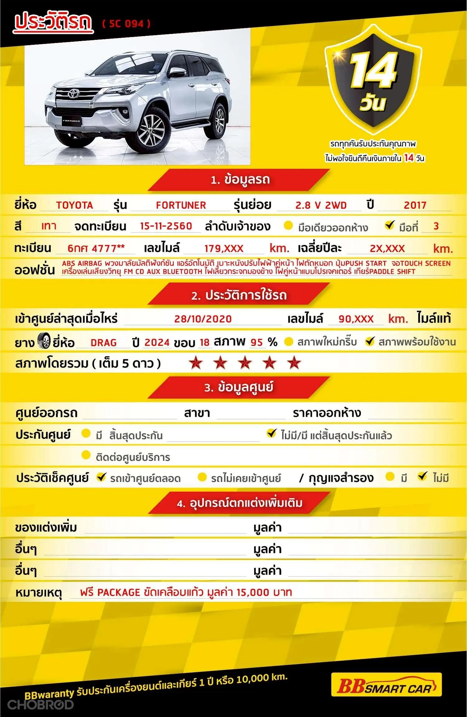 TOYOTA FORTUNER 2.8 V 2WD AT 2017 ออกรถ 0 บาท จัดได้ 759,000 บ. Line:@*******แสดงข้อมูล 🔥จอง 199 บาท ส่งบัตรประชาชน รู้ผลพิจารณาภายใน 30 นาที ไม่ผ่านคืนเงินจองทุกกรณี 🔥ซื้อรถกับ BB พร้อมให้คำปรึกษา แก้ทุกปัญหา ให้ทุกเรื่อง บริการ call center 24 ชม. 🔥BB Care Plus รับประกันหลังการขาย สูงสุด 2 ปี หรือ 20,000 km. 🔥มีรถให้เลือกมากกว่า 1,600 คัน สาขา5 ถ.เศรษฐกิจ ใกล้โลตัสมหาชัย รหัสรถ 5C094 ราคา 739,000 บ. ผ่อนเพียง 12,539 บ. Brand. : TOYOTA Year. : 2017 Model. : FORTUNER Grade. : 2.8 V 2WD Engine. : 2800 CC. Type. : ดีเซล Gearbox. : A/T Color. : เทา Mileage. : 179,xxx km. (ซื้อสด ราคานี้ยังไม่รวมค่าดำเนินการ 10,000 บ.) 🚩 Price 739,000 บาท ยอดจัด : 749,000 บาท เงินดาวน์. : 0 บาท ประกันภัย : ฟรีประกันภัย 1 ปี ค่าดำเนินการ : 10,000 บาท รวมออกรถ 0 บาท ผ่อน36= 24,125 บาท ผ่อน48 = 18,560 บาท ผ่อน60 = 15,421 บาท ผ่อน72 = 13,796 บาท ผ่อน84 = 12,539 บาท เงื่อนไขเป็นไปตามที่ไฟแนนซ์กำหนด** โปรโมชั่นพิเศษ สำหรับลูกค้าเครดิตดี 🚩เลือกรับเรทดอกเบี้ยพิเศษ 📍36 งวด = 1.29 % 📍48 งวด = 1.99 % 📍60 งวด = 2.39 % 📍72 งวด = 3.59 % 🔥เงื่อนไข โปรโมชั่น ดอกเบี้ยเริ่มต้น 1.29% ตลอดอายุสัญญา - ยอดจัดไฟแนนซ์ 300,000-600,0000 บาท - ผ่อนสูงสุด 72 เดือน - เป็นลูกค้าประวัติดี พนักงานประจำเงินเดือน 20,000 ขึ้นไป - ค่าดำเนินการแคมเปญ 20,000 บาท (รวมในยอดจัดได้) 🎗Car Hightlight. TOYOTA FORTUNER เครื่อง 2800 cc. รถยนต์เอนกประสงค์ นั่งสบายถึง 7 ที่นั่ง พร้อมเทคโนโลยีเพื่อความปลอดภัยและเป็นรถยนต์อเนกประสงค์ มาพร้อมเทคโนโลยีล้ำสมัย 🎗ภายใน. วิทยุ - CD เซ็นทรัลล๊อก Airbag กระจกมองข้างปรับไฟฟ้า เกียร์ Paddle Shift กระจกไฟฟ้า เบรค ABS จอ LCD เล่น DVD เบาะไฟฟ้าคู่หน้า พวงมาลัย Multifunction เบาะหนัง แอร์ AUTO 🎗ภายนอก. ตัวรถสีเทา แล็คหลังคา ไฟโปรเจคเตอร์ ไฟเลี้ยวกระจกมองข้าง ไฟตัดหมอก บันไดข้าง กระจกมองข้างพับไฟฟ้า 🎗ความคุ้มค่า สำหรับคันนี้หากเปรียบเทียบราคากับคุณภาพ ถือว่าคุ้มค่ามากครับ ผ่อนสบายๆก็มีรถขับได้ รถดีมีคุณภาพแบบนี้รีบตัดสินใจซื้อได้เลย ราคานี้มาไวไปไวนะคะ ⭐️การรับประกันหลังการขาย BB Care Plus สูงสุด 2 ปี หรือ 20,000 km. ด้วยช่างที่ผ่านการอบรมจากศูนย์ชั้นนำของประเทศ 🎉Special offer เฉพาะ บีบีสมาร์ทคาร์ ที่นี่ที่เดียว ⭐ดอกเบี้ยเริ่มต้น 1.29% มีไฟแนนซ์รองรับหลายที่ค่ะ ⭐ฟรี!! แพคเก็จ ขัดเคลือบแก้ว มูลค่า 15,000 บาท ทุกคัน ⭐อนุมัติไว 30 นาที นำเอกสารมาให้ครบรับรถกลับบ้านทันทีค่ะ ⭐BB Care Plus รับประกันหลังการขาย สูงสุด 2 ปี หรือ 20,000 km. ⭐มี 6 สาขา ในกรุงเทพและปริมณฑลใกล้บ้านท่าน ⭐รถทุกคันผ่านตรวจสอบ Inspection เรียบร้อยแล้วค่ะ ผ่าน 5 ดาวทุกคันค่ะ ⭐เซลล์ทุกท่านเป็นมืออาชีพพร้อมให้บริการทุกท่านแน่นอนค่ะ เลือกข้อเสนอที่ให้คุณมากกว่าที่อื่น เพราะเราเล็งเห็นแล้ว ที่บีบีสมาร์ทคาร์ ให้คุณได้มากกว่าที่อื่นแน่นอนครับ มาที่เดียวจบทุกปัญหา หลากหลายรุ่นให้เลือกกั