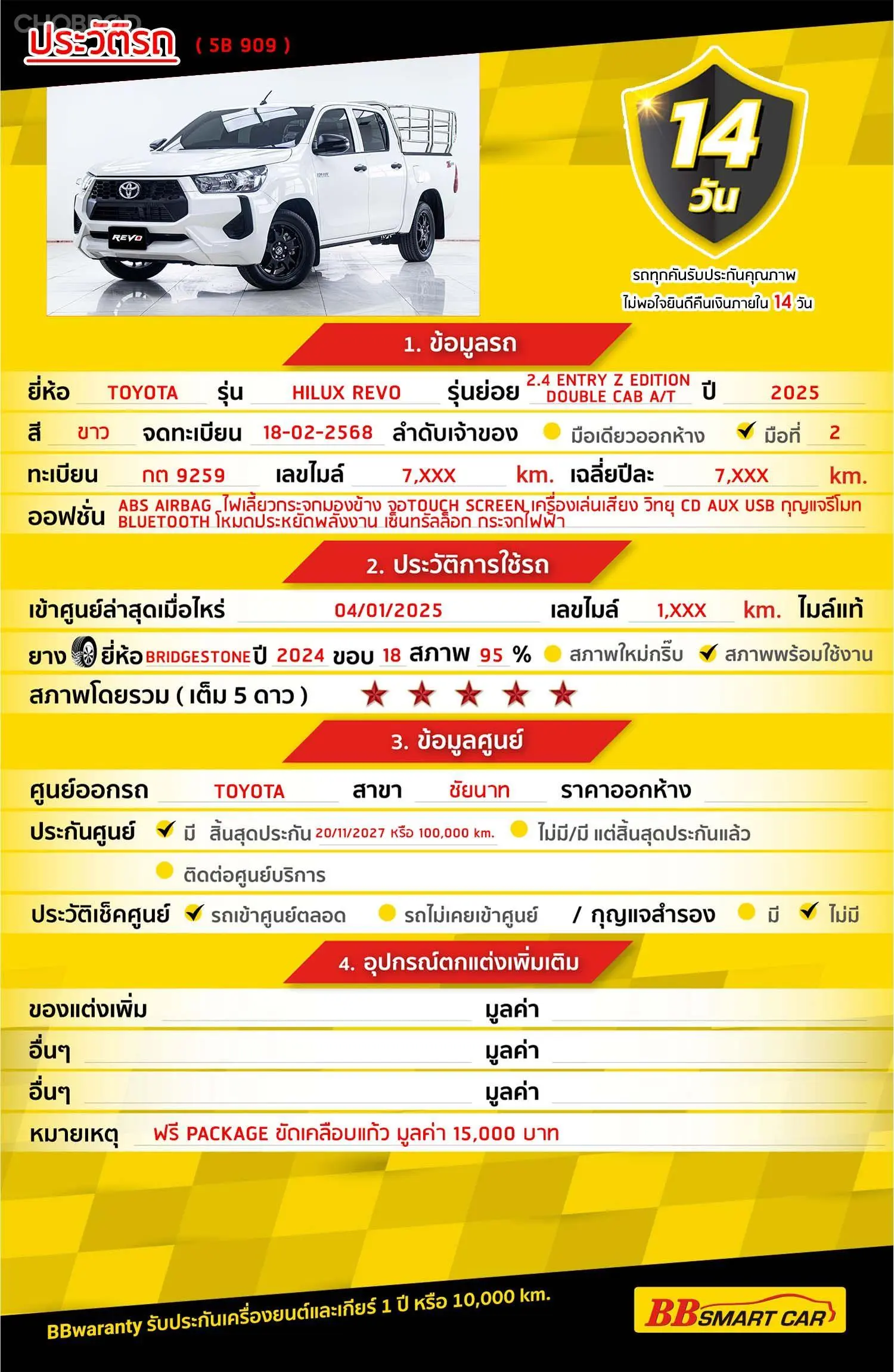 TOYOTA REVO 2.4 ENTRY Z EDITION DOUBLE CAB AT 2024 ออกรถ 0 บาท จัดได้ 574,000 บ. Line:@*******แสดงข้อมูล 🔥จอง 199 บาท ส่งบัตรประชาชน รู้ผลพิจารณาภายใน 30 นาที ไม่ผ่านคืนเงินจองทุกกรณี 🔥ซื้อรถกับ BB พร้อมให้คำปรึกษา แก้ทุกปัญหา ให้ทุกเรื่อง บริการ call center 24 ชม. 🔥BB Care Plus รับประกันหลังการขาย สูงสุด 2 ปี หรือ 20,000 km. 🔥มีรถให้เลือกมากกว่า 1,600 คัน สาขา5 ถ.เศรษฐกิจ ใกล้โลตัสมหาชัย รหัสรถ 5B909 ราคา 554,000 บาท ผ่อนเพียง 9,945 บาท Brand. : TOYOTA Year. : 2024 Model. : HILUX REVO Grade. : 2.4 ENTRY Z EDITION DOUBLE CAB Engine. : 2400 CC Type. : ดีเซล Gearbox : A/T Color. : ขาว Mileage. : 7,XXX KM (ซื้อสด ราคานี้ยังไม่รวมค่าดำเนินการ 10,000 บ.) 🚩 Price. 554,000 บาท ยอดจัด : 564,000 บาท เงินดาวน์ : 0 บาท ประกันภัย : ฟรีประกันภัย 1 ปี ค่าดำเนินการ : 10,000 บาท รวมออกรถ : 0 บาท ผ่อน 36 งวด = 19,133 บาท ผ่อน 48 งวด = 14,719 บาท ผ่อน 60 งวด = 12,230 บาท ผ่อน 72 งวด = 10,941 บาท ผ่อน 84 งวด = 9,945 บาท เงื่อนไขเป็นไปตามที่ไฟแนนซ์กำหนด** โปรโมชั่นพิเศษ สำหรับลูกค้าเครดิตดี 🚩เลือกรับเรทดอกเบี้ยพิเศษ 📍36 งวด = 1.29 % 📍48 งวด = 1.99 % 📍60 งวด = 2.39 % 📍72 งวด = 3.59 % 🔥เงื่อนไข โปรโมชั่น ดอกเบี้ยเริ่มต้น 1.29% ตลอดอายุสัญญา - ยอดจัดไฟแนนซ์ 300,000-600,000 บาท - ผ่อนสูงสุด 72 เดือน - เป็นลูกค้าประวัติดี พนักงานประจำเงินเดือน 20,000 ขึ้นไป - ค่าดำเนินการแคมเปญ 20,000 บาท (รวมในยอดจัดได้) 🎗Car Hightlight TOYOTA HILUX REVO 2.4 ENTRY Z EDITION DOUBLE CAB AT ดีเซล จุดเด่นออฟชั่น 1. กระจกมองข้างปรับไฟฟ้า 2. จอ LCD เล่น DVD 3. คิ้วกันสาด 🎗ภายใน กระจกมองข้างปรับไฟฟ้า กุญแจรีโมท-สัญญานกันขโมย เบรค ABS พวงมาลัยเพาเวอร์ เซ็นทรัลล๊อก เบาะหนัง แอร์ จอ LCD เล่น DVD วิทยุ - CD Airbag คิ้วกันสาด ไฟเลี้ยวกระจกมองข้าง 🎗ภายนอก ตัวรถสีขาว มาพร้อม คิ้วกันสาด ไฟเลี้ยวกระจกมองข้าง 🎗ความคุ้มค่า สำหรับคันนี้หากเปรียบเทียบราคากับคุณภาพ คันนี้ถือว่าคุ้มค่ามากค่ะ ผ่อนสบายๆก็มีรถขับได้ รถดีมีคุณภาพแบบนี้รีบตัดสินใจซื้อได้เลราคานี้มาไวไปไวนะคะ ⭐️การรับประกันหลังการขาย BB Care Plus สูงสุด 2 ปี หรือ 20,000 km. ด้วยช่างที่ผ่านการอบรมจากศูนย์ชั้นนำของประเทศ 🎉Special offer เฉพาะ บีบีสมาร์ทคาร์ ที่นี่ที่เดียว ⭐ดอกเบี้ยเริ่มต้น 1.29 % มีไฟแนนซ์รองรับหลายที่ค่ะ ⭐ฟรี!! แพคเก็จ ขัดเคลือบแก้ว มูลค่า 15,000 บาท ทุกคัน ⭐อนุมัติไว 30 นาที นำเอกสารมาให้ครบรับรถกลับบ้านทันทีค่ะ ⭐BB Care Plus รับประกันหลังการขาย สูงสุด 2 ปี หรือ 20,000 km. ⭐มี 6 สาขา ในกรุงเทพและปริมณฑลใกล้บ้านท่าน ⭐รถทุกคันผ่านตรวจสอบ Inspection เรียบร้อยแล้วค่ะ ผ่าน 5 ดาวทุกคันค่ะ ⭐เซลล์ทุกท่านเป็นมืออาชีพพร้อมให้บริการทุกท่านแน่นอนค่ะ