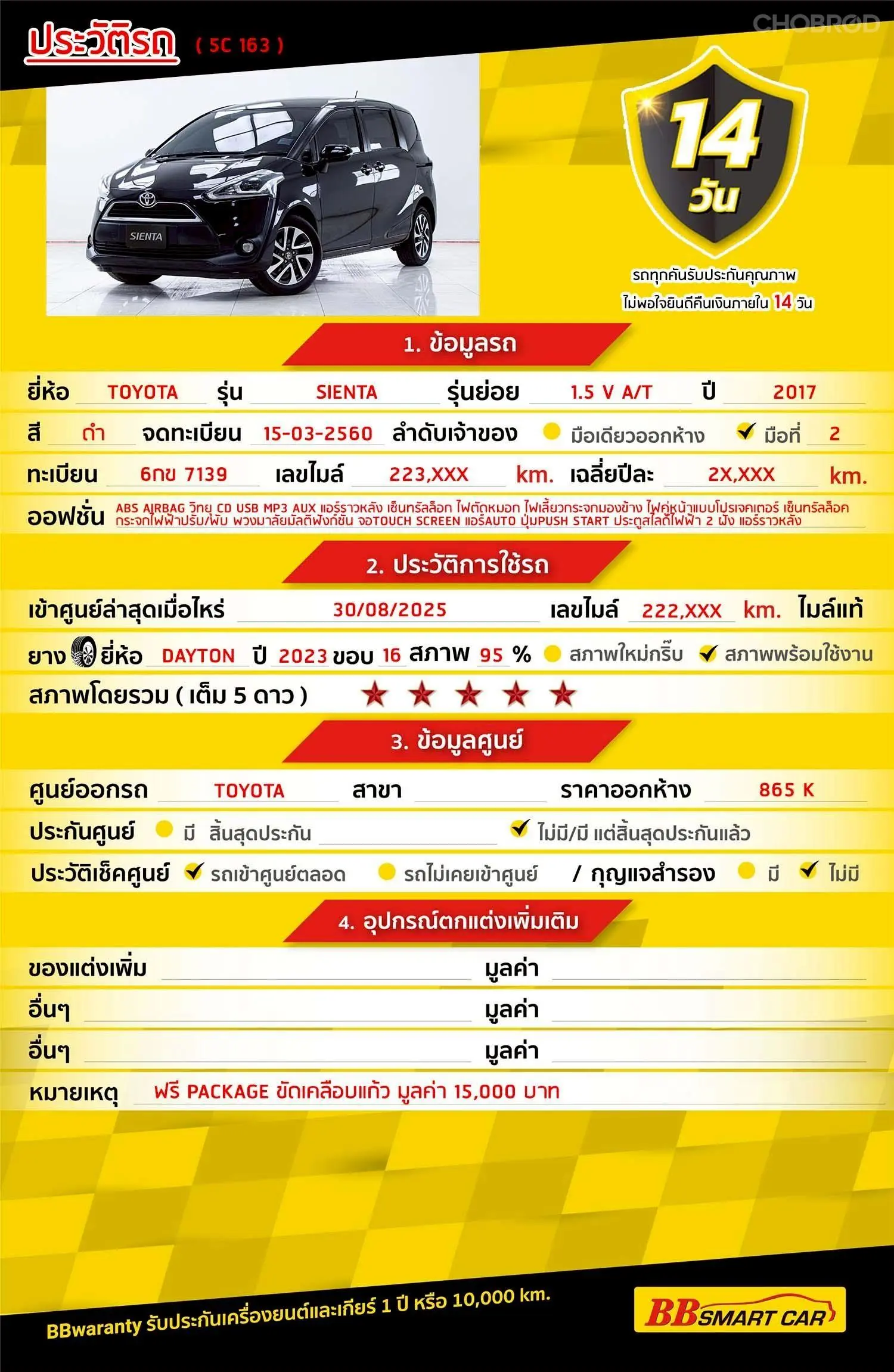 TOYOTA SIENTA 1.5 V AT 2017 ออกรถ 0 บาท จัดได้ 399,000 บ. Line:@*******แสดงข้อมูล 🔥จอง 199 บาท ส่งบัตรประชาชน รู้ผลพิจารณาภายใน 30 นาที ไม่ผ่านคืนเงินจองทุกกรณี 🔥ซื้อรถกับ BB พร้อมให้คำปรึกษา แก้ทุกปัญหา ให้ทุกเรื่อง บริการ call center 24 ชม. 🔥BB Care Plus รับประกันหลังการขาย สูงสุด 2 ปี หรือ 20,000 km. 🔥มีรถให้เลือกมากกว่า 1,800 คัน สาขา5 ถ.เศรษฐกิจ ใกล้โลตัสมหาชัย รหัสรถ 5C163 ราคา 379,000 บาท ผ่อนเพียง 6,512 บาท Brand. : TOYOTA Year. : 2017 Model. : SIENTA Grade. : 1.5 V Engine. : 1500 CC. Type. : เบนซิน Gearbox : A/T Color. : ดำ Mileage. : 223,XXX KM. (ซื้อสด ราคานี้ยังไม่รวมค่าดำเนินการ 10,000 บ.) 🚩 Price. 379,000 บาท ยอดจัด : 389,000 บาท เงินดาวน์ : 0 บาท ประกันภัย : ฟรีประกันภัย 1 ปี ค่าดำเนินการ : 10,000 บาท รวมออกรถ : 0 บาท ผ่อน 36 งวด = 12,530 บาท ผ่อน 48 งวด = 9,640 บาท ผ่อน 60 งวด = 8,009 บาท ผ่อน 72 งวด = 7,165 บาท ผ่อน 84 งวด = 6,512 บาท เงื่อนไขเป็นไปตามที่ไฟแนนซ์กำหนด โปรโมชั่นพิเศษ สำหรับลูกค้าเครดิตดีเลือกรับเรทดอกเบี้ยพิเศษ 📍36 งวด = 1.29 % 📍48 งวด = 1.99 % 📍60 งวด = 2.39 % 📍72 งวด = 3.59 % 🔥เงื่อนไข โปรโมชั่น ดอกเบี้ยเริ่มต้น 1.29% ตลอดอายุสัญญา - ยอดจัดไฟแนนซ์ 300,000-600,000 บาท - ผ่อนสูงสุด 72 เดือน - เป็นลูกค้าประวัติดี พนักงานประจำเงินเดือน 20,000 ขึ้นไป - ค่าดำเนินการแคมเปญ 20,000 บาท (รวมในยอดจัดได้) 🎗Car Hightlight รถสวยๆ วันนี้ขอแนะนำ TOYOTA SIENTA 1.5 V AT เบนซิน จุดเด่นออฟชั่น 1 : จอ LCD เล่น DVD 2 : ไฟตัดหมอก 3 : พวงมาลัย Multifunction 🎗ภายใน จอ LCD เล่น DVD เซ็นทรัลล๊อก วิทยุ - CD กระจกมองข้างปรับไฟฟ้า กระจกไฟฟ้า พวงมาลัย Multifunction Airbag เบรค ABS เบาะหนัง แอร์ AUTO 🎗ภายนอก ตัวรถสีดำ กระจกมองข้างพับไฟฟ้า ไฟเลี้ยวกระจกมองข้าง ไฟโปรเจคเตอร์ ไฟตัดหมอก 🎗ความคุ้มค่า สำหรับคันนี้หากเปรียบเทียบราคากับคุณภาพ คันนี้ถือว่าคุ้มค่ามากค่ะ ผ่อนสบายๆก็มีรถขับได้ รถดีมีคุณภาพแบบนี้รีบตัดสินใจซื้อได้เลราคานี้มาไวไปไวนะคะ ⭐️การรับประกันหลังการขาย BB Care Plus สูงสุด 2 ปี หรือ 20,000 km. ด้วยช่างที่ผ่านการอบรมจากศูนย์ชั้นนำของประเทศ 🎉Special offer เฉพาะ บีบีสมาร์ทคาร์ ที่นี่ที่เดียว ⭐ดอกเบี้ยเริ่มต้น 1.29% มีไฟแนนซ์รองรับหลายที่ค่ะ ⭐ฟรี!! แพคเก็จ ขัดเคลือบแก้ว มูลค่า 15,000 บาท ทุกคัน ⭐อนุมัติไว 30 นาที นำเอกสารมาให้ครบรับรถกลับบ้านทันทีค่ะ ⭐BB Care Plus รับประกันหลังการขาย สูงสุด 2 ปี หรือ 20,000 km. ⭐มี 6 สาขา ในกรุงเทพและปริมณฑลใกล้บ้านท่าน ⭐รถทุกคันผ่านตรวจสอบ Inspection เรียบแล้วค่ะ ผ่าน 5 ดาวทุกคันค่ะ ⭐เซลล์ทุกท่านเป็นมืออาชีพพร้อมให้บริการทุกท่านแน่นอนค่ะ