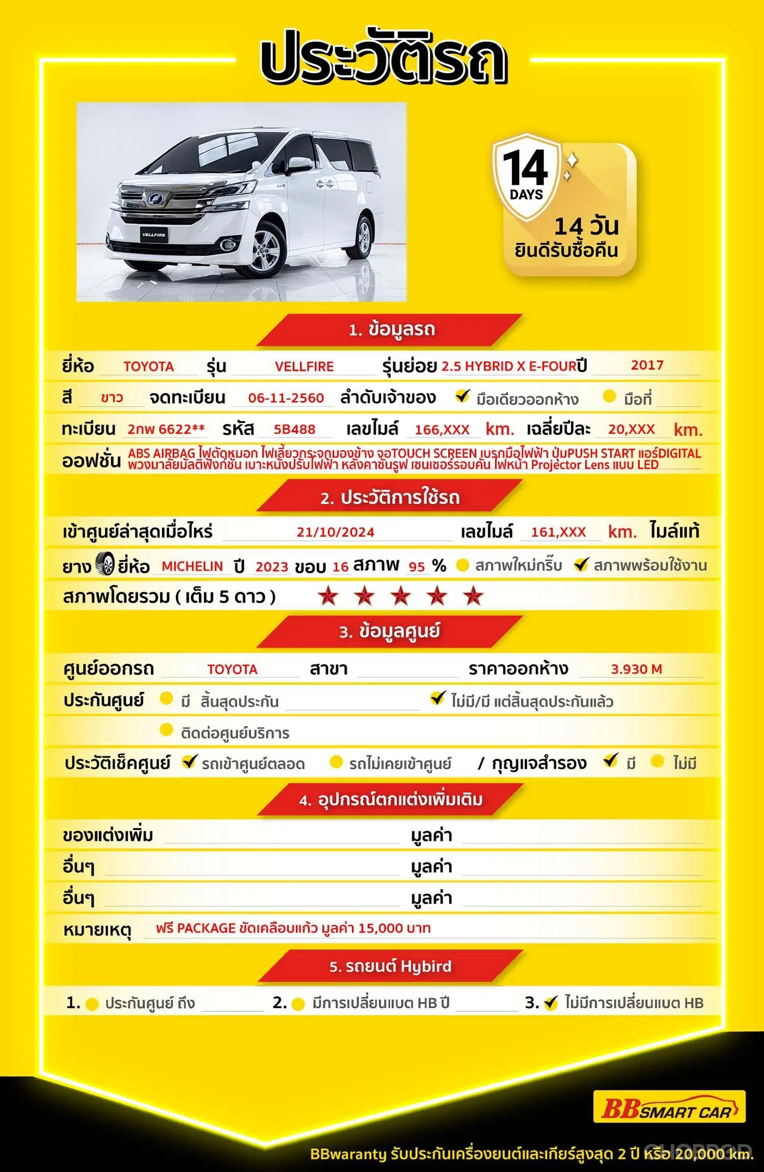 TOYOTA VELLFIRE 2.5 HYBRID AT 2017 ออกรถ 0 บาท จัดได้ 1,104,000 บ. Line:********แสดงข้อมูล 🔥จอง 199 บาท ส่งบัตรประชาชน รู้ผลพิจารณาภายใน 30 นาที ไม่ผ่านคืนเงินจองทุกกรณี 🔥ซื้อรถกับ BB พร้อมให้คำปรึกษา แก้ทุกปัญหา ให้ทุกเรื่อง บริการ call center 24 ชม. 🔥BB Care Plus รับประกันหลังการขาย สูงสุด 2 ปี หรือ 20,000 km. 🔥มีรถให้เลือกมากกว่า 1,800 คัน บีบีสมาร์ทคาร์ 5 สาขามหาชัย รหัสรถ 5B488 ราคา 1,084,000 บาท ผ่อนเพียง 19,655 บาท Brand. : TOYOTA Year. : 2017 Model. : VELLFIRE Grade. : 2.5 HYBRID X E-FOUR Engine. : 2500 CC Type. : เบนซิน+ไฟฟ้า Gearbox : A/T Color. : ขาว Mileage. : 166,XXX KM. (ซื้อสด ราคานี้ยังไม่รวมค่าดำเนินการ 10,000 บ.) 🚩 Price. 1,084,000 บาท ยอดจัด : 1,094,000 บาท เงินดาวน์ : 0 บาท ประกันภัย : ฟรีประกันภัย 1 ปี ค่าดำเนินการ : 10,000 บาท รวมออกรถ : 0 บาท ผ่อน36 = 37,815 บาท ผ่อน48 = 29,091 บาท ผ่อน60 = 24,171 บาท ผ่อน72 = 21,624 บาท ผ่อน84 = 19,655 บาท เงื่อนไขเป็นไปตามที่ไฟแนนซ์กำหนด** โปรโมชั่นพิเศษ สำหรับลูกค้าเครดิตดี 🚩เลือกรับเรทดอกเบี้ยพิเศษ 📍36 งวด = 1.29 % 📍48 งวด = 1.99 % 📍60 งวด = 2.39 % 📍72 งวด = 3.59 % 🔥เงื่อนไข โปรโมชั่น ดอกเบี้ยเริ่มต้น 1.29% ตลอดอายุสัญญา - ยอดจัดไฟแนนซ์ 300,000-600,0000 บาท - ผ่อนสูงสุด 72 เดือน - เป็นลูกค้าประวัติดี พนักงานประจำเงินเดือน 20,000 ขึ้นไป - ค่าดำเนินการแคมเปญ 20,000 บาท (รวมในยอดจัดได้) 🎗Car Hightlight รถสวยๆ วันนี้ขอแนะนำ TOYOTA VELLFIRE 2.5 HYBRID 2017 AT เบนซิน 1 : เบาะไฟฟ้ารอบคัน 2 : กระจกมองข้างปรับไฟฟ้า 3 : เซนเซอร์รอบคัน 🎗ภายใน ซันรูฟ จอ LCD เล่น DVD เบรค ABS กระจกไฟฟ้า เบรกมือไฟฟ้า Navigator วิทยุ - CD เบาะหนัง Airbag เซ็นทรัลล๊อก แอร์ AUTO พวงมาลัย Multifunction เบาะไฟฟ้ารอบคัน แอร์ 🎗ภายนอก กระจกมองข้างปรับไฟฟ้า เซนเซอร์รอบคัน ไฟเลี้ยวกระจกมองข้าง ไฟตัดหมอก ไฟโปรเจคเตอร์ กระจกมองข้างพับไฟฟ้า เซนเซอร์ถอยหลัง 🎗ความคุ้มค่า สำหรับคันนี้หากเปรียบเทียบราคากับคุณภาพ คันนี้ถือว่าคุ้มค่ามากค่ะ ผ่อนสบายๆก็มีรถขับได้ รถดีมีคุณภาพแบบนี้รีบตัดสินใจซื้อได้เลราคานี้มาไวไปไวนะคะ ⭐️การรับประกันหลังการขาย BB Care Plus สูงสุด 2 ปี หรือ 20,000 km. ด้วยช่างที่ผ่านการอบรมจากศูนย์ชั้นนำของประเทศ 🎉Special offer เฉพาะ บีบีสมาร์ทคาร์ ที่นี่ที่เดียว ⭐ดอกเบี้ยเริ่มต้น 1.29% มีไฟแนนซ์รองรับหลายที่ค่ะ ⭐ฟรี!! แพคเก็จ ขัดเคลือบแก้ว มูลค่า 15,000 บาท ทุกคัน ⭐อนุมัติไว 30 นาที นำเอกสารมาให้ครบรับรถกลับบ้านทันทีค่ะ ⭐BB Care Plus รับประกันหลังการขาย สูงสุด 2 ปี หรือ 20,000 km. ⭐มี 6 สาขา ในกรุงเทพและปริมณฑลใกล้บ้านท่าน ⭐รถทุกคันผ่านตรวจสอบ Inspection เรียบแล้วค่ะ ผ่าน 5 ดาวทุกคันค่ะ ⭐เซลล์ทุกท่านเป็นมืออาชีพพร้อมให้บริการทุกท่านแน่นอนค่ะ