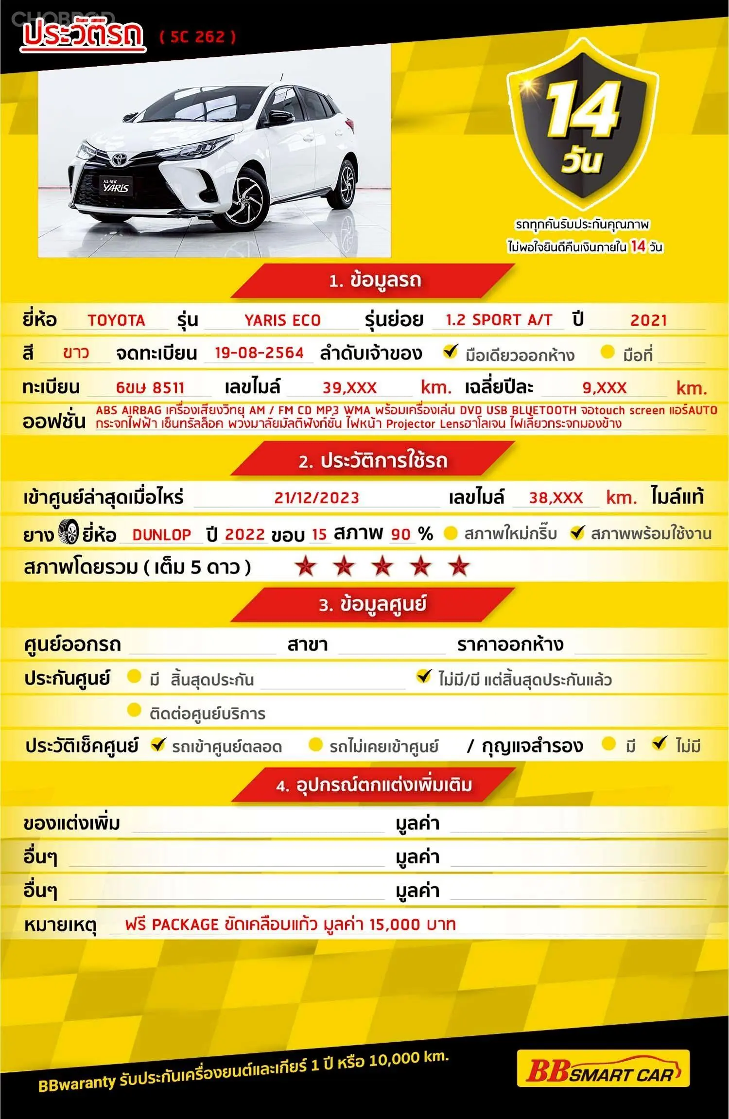 TOYOTA YARIS ECO 1.2 SPORT AT 2021 ออกรถ 0 บาท จัดได้ 379,000 บ. Line:@*******แสดงข้อมูล 🔥จอง 199 บาท ส่งบัตรประชาชน รู้ผลพิจารณาภายใน 30 นาที ไม่ผ่านคืนเงินจองทุกกรณี 🔥ซื้อรถกับ BB พร้อมให้คำปรึกษา แก้ทุกปัญหา ให้ทุกเรื่อง บริการ call center 24 ชม. 🔥BB Care Plus รับประกันหลังการขาย สูงสุด 2 ปี หรือ 20,000 km. 🔥มีรถให้เลือกมากกว่า 1,800 คัน บีบีสมาร์ทคาร์ 5 สาขามหาชัย รหัสรถ 5C262 ราคา 359,000 บาท ผ่อนเพียง 6,680 บาท Brand. : TOYOTA Year. : 2021 Model. : YARIS ECO Grade. : 1.2 SPORT Engine. : 1200 CC Type. : เบนซิน Gearbox : A/T Color. : ขาว Mileage. : 39,XXX KM. (ซื้อสด ราคานี้ยังไม่รวมค่าดำเนินการ 10,000 บ.) 🚩 Price. 359,000 บาท ยอดจัด : 369,000 บาท เงินดาวน์ : 0 บาท ประกันภัย : ฟรีประกันภัย 1 ปี ค่าดำเนินการ : 10,000 บาท รวมออกรถ : 0 บาท ผ่อน36 = 12,959 บาท ผ่อน48 = 9,994 บาท ผ่อน60 = 8,535 บาท ผ่อน72 = 7,385 บาท ผ่อน84 = 6,680 บาท เงื่อนไขเป็นไปตามที่ไฟแนนซ์กำหนด** โปรโมชั่นพิเศษ สำหรับลูกค้าเครดิตดี 🚩เลือกรับเรทดอกเบี้ยพิเศษ 📍36 งวด = 1.29 % 📍48 งวด = 1.99 % 📍60 งวด = 2.39 % 📍72 งวด = 3.59 % 🔥เงื่อนไข โปรโมชั่น ดอกเบี้ยเริ่มต้น 1.29% ตลอดอายุสัญญา - ยอดจัดไฟแนนซ์ 300,000-600,0000 บาท - ผ่อนสูงสุด 72 เดือน - เป็นลูกค้าประวัติดี พนักงานประจำเงินเดือน 20,000 ขึ้นไป - ค่าดำเนินการแคมเปญ 20,000 บาท (รวมในยอดจัดได้) 🎗Car Hightlight รถสวยๆ วันนี้ขอแนะนำ TOYOTA YARIS ECO 1.2 SPORT 2016 เบนซิน 1 : พวงมาลัย Multifunction 2 : วิทยุ - CD 🎗ภายใน เบรค ABS กุญแจรีโมท-สัญญานกันขโมย พวงมาลัย Multifunction จอ LCD เล่น DVD เบาะหนัง แอร์ AUTO กระจกไฟฟ้า เซ็นทรัลล๊อก กระจกมองข้างปรับไฟฟ้า Airbag วิทยุ - CD 🎗ภายนอก ตัวรถสีขาว สวยเรียบหรูมาพร้อม ไฟเลี้ยวกระจกมองข้าง คิ้วกันสาด กระจกมองข้างพับไฟฟ้า 🎗ความคุ้มค่า สำหรับคันนี้หากเปรียบเทียบราคากับคุณภาพ คันนี้ถือว่าคุ้มค่ามากค่ะ ผ่อนสบายๆก็มีรถขับได้ รถดีมีคุณภาพแบบนี้รีบตัดสินใจซื้อได้เลราคานี้มาไวไปไวนะคะ ⭐️การรับประกันหลังการขาย BB Care Plus สูงสุด 2 ปี หรือ 20,000 km. ด้วยช่างที่ผ่านการอบรมจากศูนย์ชั้นนำของประเทศ 🎉Special offer เฉพาะ บีบีสมาร์ทคาร์ ที่นี่ที่เดียว ⭐ดอกเบี้ยเริ่มต้น 1.29% มีไฟแนนซ์รองรับหลายที่ค่ะ ⭐ฟรี!! แพคเก็จ ขัดเคลือบแก้ว มูลค่า 15,000 บาท ทุกคัน ⭐อนุมัติไว 30 นาที นำเอกสารมาให้ครบรับรถกลับบ้านทันทีค่ะ ⭐BB Care Plus รับประกันหลังการขาย สูงสุด 2 ปี หรือ 20,000 km. ⭐มี 6 สาขา ในกรุงเทพและปริมณฑลใกล้บ้านท่าน ⭐รถทุกคันผ่านตรวจสอบ Inspection เรียบแล้วค่ะ ผ่าน 5 ดาวทุกคันค่ะ ⭐เซลล์ทุกท่านเป็นมืออาชีพพร้อมให้บริการทุกท่านแน่นอนค่ะ เลือกข้อเสนอที่ให้คุณมากกว่าที่อื่น เพราะเราเล็งเห็นแล้ว ที่บีบีสมาร์ทคาร์ ให้คุณได้มากกว่าที่อื่นแน่นอนครับ มาที่เดียวจบทุกปัญหา หลากหลายรุ่นให้เลือกกับบริการที่คุณต้องประทับใจแน่นอนครับ