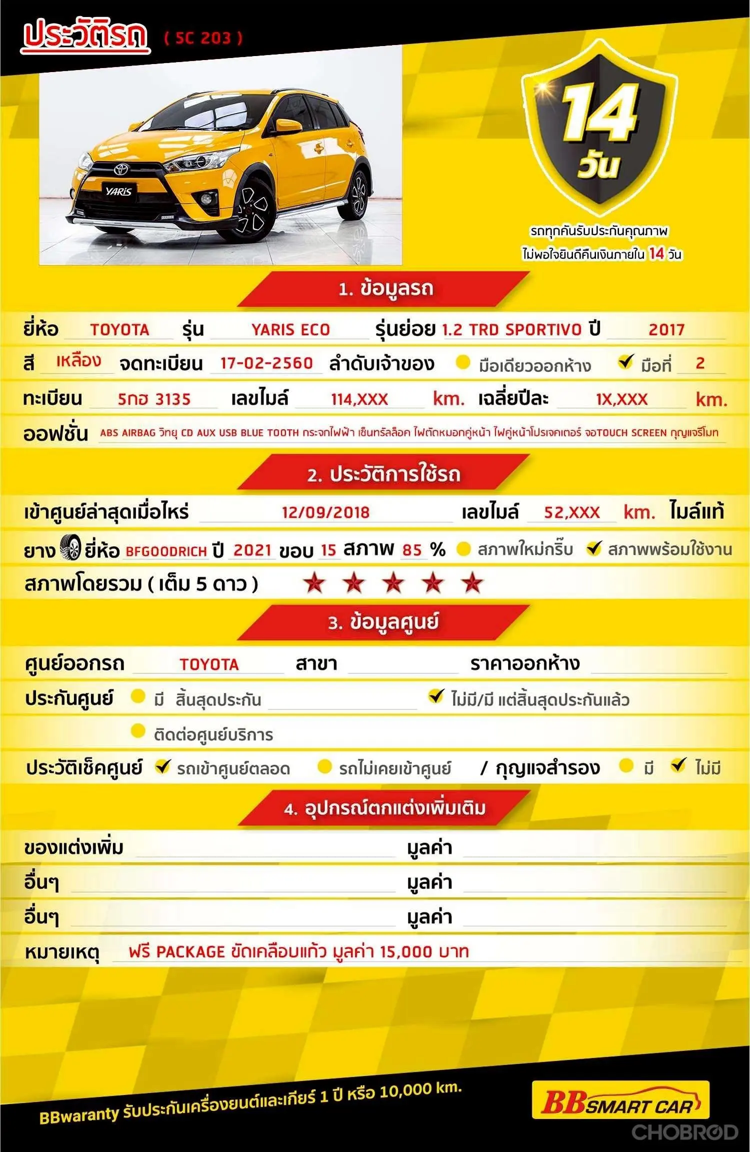 TOYOTA YARIS ECO 1.2 TRD SPORTIVO AT 2017 ออกรถ 0 บาท จัดได้ 329,000 บ. Line:@BBCAR05 🔥จอง 199 บาท ส่งบัตรประชาชน รู้ผลพิจารณาภายใน 30 นาที ไม่ผ่านคืนเงินจองทุกกรณี 🔥ซื้อรถกับ BB พร้อมให้คำปรึกษา แก้ทุกปัญหา ให้ทุกเรื่อง บริการ call center 24 ชม. 🔥BB Care Plus รับประกันหลังการขาย สูงสุด 2 ปี หรือ 20,000 km. 🔥มีรถให้เลือกมากกว่า 1,800 คัน บีบีสมาร์ทคาร์ 5 สาขามหาชัย รหัสรถ 5C203 ราคา 309,000 บาท ผ่อนเพียง 5,340 บาท Brand. : TOYOTA Year. : 2017 Model. : YARIS ECO Grade. : 1.2 TRD SPORTIVO Engine. : 1200 CC Type. : เบนซิน Gearbox : A/T Color. : เหลือง Mileage. : 114,XXX KM. (ซื้อสด ราคานี้ยังไม่รวมค่าดำเนินการ 10,000 บ.) 🚩 Price. 309,000 บาท ยอดจัด : 319,000 บาท เงินดาวน์ : 0 บาท ประกันภัย : ฟรีประกันภัย 1 ปี ค่าดำเนินการ : 10,000 บาท รวมออกรถ : 0 บาท ผ่อน36 = 10,275 บาท ผ่อน48 = 7,905 บาท ผ่อน60 = 6,568 บาท ผ่อน72 = 5,875 บาท ผ่อน84 = 5,340 บาท เงื่อนไขเป็นไปตามที่ไฟแนนซ์กำหนด** โปรโมชั่นพิเศษ สำหรับลูกค้าเครดิตดี 🚩เลือกรับเรทดอกเบี้ยพิเศษ 📍36 งวด = 1.29 % 📍48 งวด = 1.99 % 📍60 งวด = 2.39 % 📍72 งวด = 3.59 % 🔥เงื่อนไข โปรโมชั่น ดอกเบี้ยเริ่มต้น 1.29% ตลอดอายุสัญญา - ยอดจัดไฟแนนซ์ 300,000-600,0000 บาท - ผ่อนสูงสุด 72 เดือน - เป็นลูกค้าประวัติดี พนักงานประจำเงินเดือน 20,000 ขึ้นไป - ค่าดำเนินการแคมเปญ 20,000 บาท (รวมในยอดจัดได้) 🎗Car Hightlight รถสวยๆ วันนี้ขอแนะนำ TOYOTA YARIS ECO 1.2 TRD SPORTIVO 2017 เบนซิน 1 : พวงมาลัย Multifunction 2 : จอ LCD เล่น DVD 3 : กระจกมองข้างปรับไฟฟ้า 🎗ภายใน กุญแจรีโมท-สัญญานกันขโมย พวงมาลัย Multifunction เบาะหนัง กระจกไฟฟ้า เซ็นทรัลล๊อก จอ LCD เล่น DVD กระจกมองข้างปรับไฟฟ้า Airbag เบรค ABS แอร์ วิทยุ - CD 🎗ภายนอก ตัวรถสีเหลือง สวยเรียบหรูมาพร้อม ชุดแต่งสเกิร์ตรอบคัน กระจกมองข้างพับไฟฟ้า ไฟเลี้ยวกระจกมองข้าง คิ้วกันสาด ไฟตัดหมอก ไฟโปรเจคเตอร์ 🎗ความคุ้มค่า สำหรับคันนี้หากเปรียบเทียบราคากับคุณภาพ คันนี้ถือว่าคุ้มค่ามากค่ะ ผ่อนสบายๆก็มีรถขับได้ รถดีมีคุณภาพแบบนี้รีบตัดสินใจซื้อได้เลราคานี้มาไวไปไวนะคะ ⭐️การรับประกันหลังการขาย BB Care Plus สูงสุด 2 ปี หรือ 20,000 km. ด้วยช่างที่ผ่านการอบรมจากศูนย์ชั้นนำของประเทศ 🎉Special offer เฉพาะ บีบีสมาร์ทคาร์ ที่นี่ที่เดียว ⭐ดอกเบี้ยเริ่มต้น 1.29% มีไฟแนนซ์รองรับหลายที่ค่ะ ⭐ฟรี!! แพคเก็จ ขัดเคลือบแก้ว มูลค่า 15,000 บาท ทุกคัน ⭐อนุมัติไว 30 นาที นำเอกสารมาให้ครบรับรถกลับบ้านทันทีค่ะ ⭐BB Care Plus รับประกันหลังการขาย สูงสุด 2 ปี หรือ 20,000 km. ⭐มี 6 สาขา ในกรุงเทพและปริมณฑลใกล้บ้านท่าน ⭐รถทุกคันผ่านตรวจสอบ Inspection เรียบแล้วค่ะ ผ่าน 5 ดาวทุกคันค่ะ ⭐เซลล์ทุกท่านเป็นมืออาชีพพร้อมให้บริการทุกท่านแน่นอนค่ะ