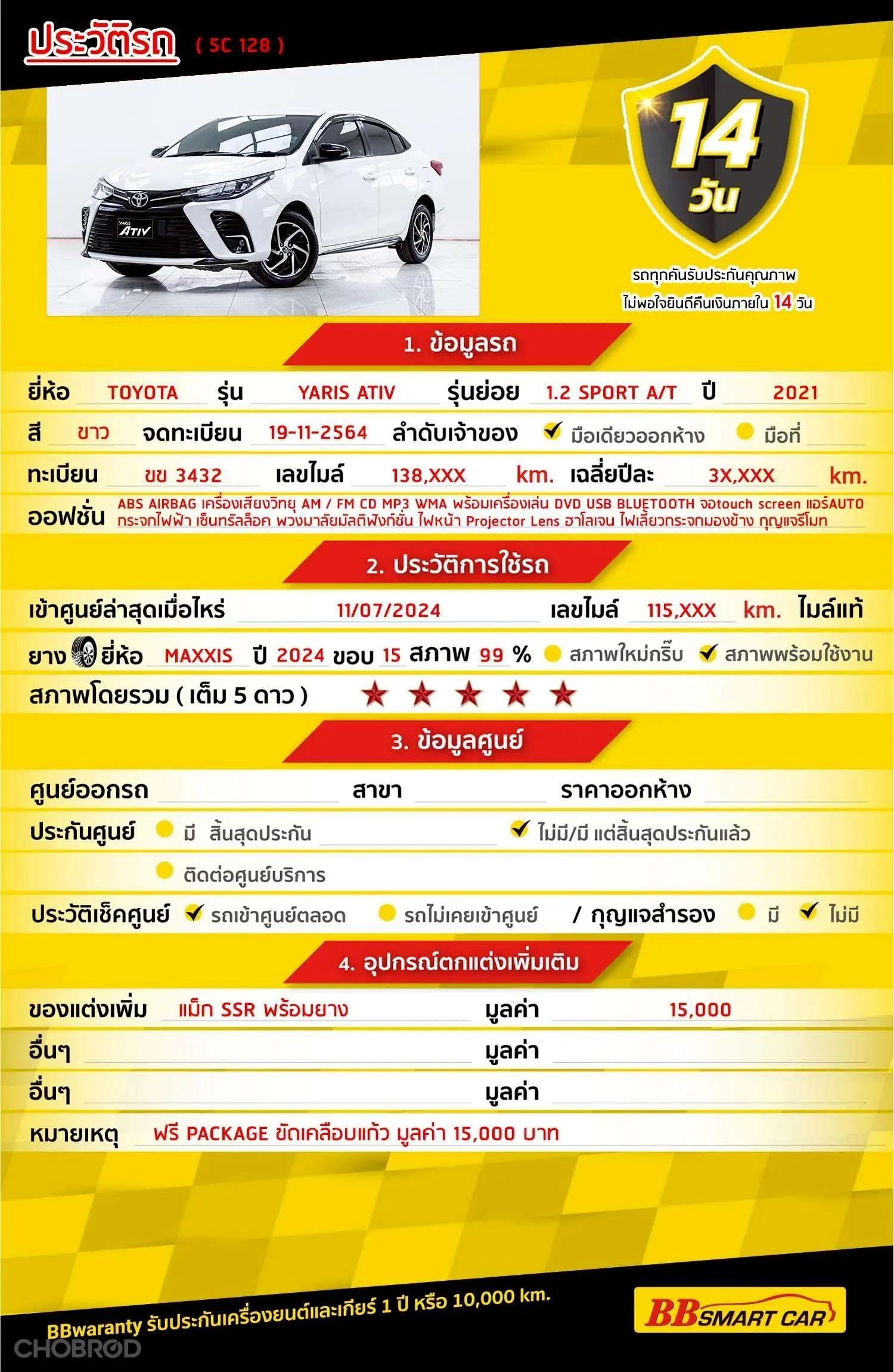 TOYOTA YARIS ATIV 1.2 SPORT AT 2021 ออกรถ 0 บาท จัดได้ 379,000 บ. Line:@*******แสดงข้อมูล 🔥จอง 199 บาท ส่งบัตรประชาชน รู้ผลพิจารณาภายใน 30 นาที ไม่ผ่านคืนเงินจองทุกกรณี 🔥ซื้อรถกับ BB พร้อมให้คำปรึกษา แก้ทุกปัญหา ให้ทุกเรื่อง บริการ call center 24 ชม. 🔥BB Care Plus รับประกันหลังการขาย สูงสุด 2 ปี หรือ 20,000 km. 🔥มีรถให้เลือกมากกว่า 1,600 คัน บีบีสมาร์ทคาร์ 5 สาขามหาชัย รหัสรถ 5C128 ราคา 359,000 บาท ผ่อนเพียง 6,178 บาท Brand. : TOYOTA Year. : 2021 Model. : YARIS ATIV Grade. : 1.2 SPORT Engine. : 1200 CC Type. : เบนซิน Gearbox : A/T Color. : ขาว Mileage. : 138,XXX KM. (ซื้อสด ราคานี้ยังไม่รวมค่าดำเนินการ 10,000 บ.) 🚩 Price. 359,000 บาท ยอดจัด : 369,000 บาท เงินดาวน์ : 0 บาท ประกันภัย : ฟรีประกันภัย 1 ปี ค่าดำเนินการ : 10,000 บาท รวมออกรถ : 0 บาท ผ่อน36 = 11,886 บาท ผ่อน48 = 9,143 บาท ผ่อน60 = 7,597 บาท ผ่อน72 = 6,797 บาท ผ่อน84 = 6,178 บาท เงื่อนไขเป็นไปตามที่ไฟแนนซ์กำหนด** โปรโมชั่นพิเศษ สำหรับลูกค้าเครดิตดี 🚩เลือกรับเรทดอกเบี้ยพิเศษ 📍36 งวด = 1.29 % 📍48 งวด = 1.99 % 📍60 งวด = 2.39 % 📍72 งวด = 3.59 % 🔥เงื่อนไข โปรโมชั่น ดอกเบี้ยเริ่มต้น 1.29% ตลอดอายุสัญญา - ยอดจัดไฟแนนซ์ 300,000-600,0000 บาท - ผ่อนสูงสุด 72 เดือน - เป็นลูกค้าประวัติดี พนักงานประจำเงินเดือน 20,000 ขึ้นไป - ค่าดำเนินการแคมเปญ 20,000 บาท (รวมในยอดจัดได้) 🎗Car Hightlight รถสวยๆ วันนี้ขอแนะนำ TOYOTA YARIS ATIV 1.2 SPORT 2021 AT เบนซิน 1 : พวงมาลัย Multifunction 2 : จอ LCD เล่น DVD 3 : ชุดแต่งสเกิร์ตรอบคัน 🎗ภายใน เบรค ABS กระจกมองข้างปรับไฟฟ้า พวงมาลัย Multifunction กระจกไฟฟ้า Airbag กุญแจรีโมท-สัญญานกันขโมย จอ LCD เล่น DVD เซ็นทรัลล๊อก เบาะหนัง วิทยุ - CD แอร์ AUTO 🎗ภายนอก ตัวรถสีขาว สวยเรียบหรูมาพร้อม ไฟตัดหมอก คิ้วกันสาด ไฟโปรเจคเตอร์ กระจกมองข้างพับไฟฟ้า ชุดแต่งสเกิร์ตรอบคัน ไฟเลี้ยวกระจกมองข้าง 🎗ความคุ้มค่า สำหรับคันนี้หากเปรียบเทียบราคากับคุณภาพ คันนี้ถือว่าคุ้มค่ามากค่ะ ผ่อนสบายๆก็มีรถขับได้ รถดีมีคุณภาพแบบนี้รีบตัดสินใจซื้อได้เลราคานี้มาไวไปไวนะคะ ⭐️การรับประกันหลังการขาย BB Care Plus สูงสุด 2 ปี หรือ 20,000 km. ด้วยช่างที่ผ่านการอบรมจากศูนย์ชั้นนำของประเทศ 🎉Special offer เฉพาะ บีบีสมาร์ทคาร์ ที่นี่ที่เดียว ⭐ดอกเบี้ยเริ่มต้น 1.29% มีไฟแนนซ์รองรับหลายที่ค่ะ ⭐ฟรี!! แพคเก็จ ขัดเคลือบแก้ว มูลค่า 15,000 บาท ทุกคัน ⭐อนุมัติไว 30 นาที นำเอกสารมาให้ครบรับรถกลับบ้านทันทีค่ะ ⭐BB Care Plus รับประกันหลังการขาย สูงสุด 2 ปี หรือ 20,000 km. ⭐มี 6 สาขา ในกรุงเทพและปริมณฑลใกล้บ้านท่าน ⭐รถทุกคันผ่านตรวจสอบ Inspection เรียบแล้วค่ะ ผ่าน 5 ดาวทุกคันค่ะ ⭐เซลล์ทุกท่านเป็นมืออาชีพพร้อมให้บริการทุกท่านแน่นอนค่ะ เลือกข้อเสนอที่ให้คุณมากกว่าที่อื่น เพราะเราเล็งเห็นแล้ว ที่บีบีสมาร์ทคาร์ ให้คุณได้มากกว่าที่อื่นแน่นอนครับ มาที่เดียวจบทุกปัญหา หลากหลายรุ่นให้เลือกกับบริการที่คุณต้องประ